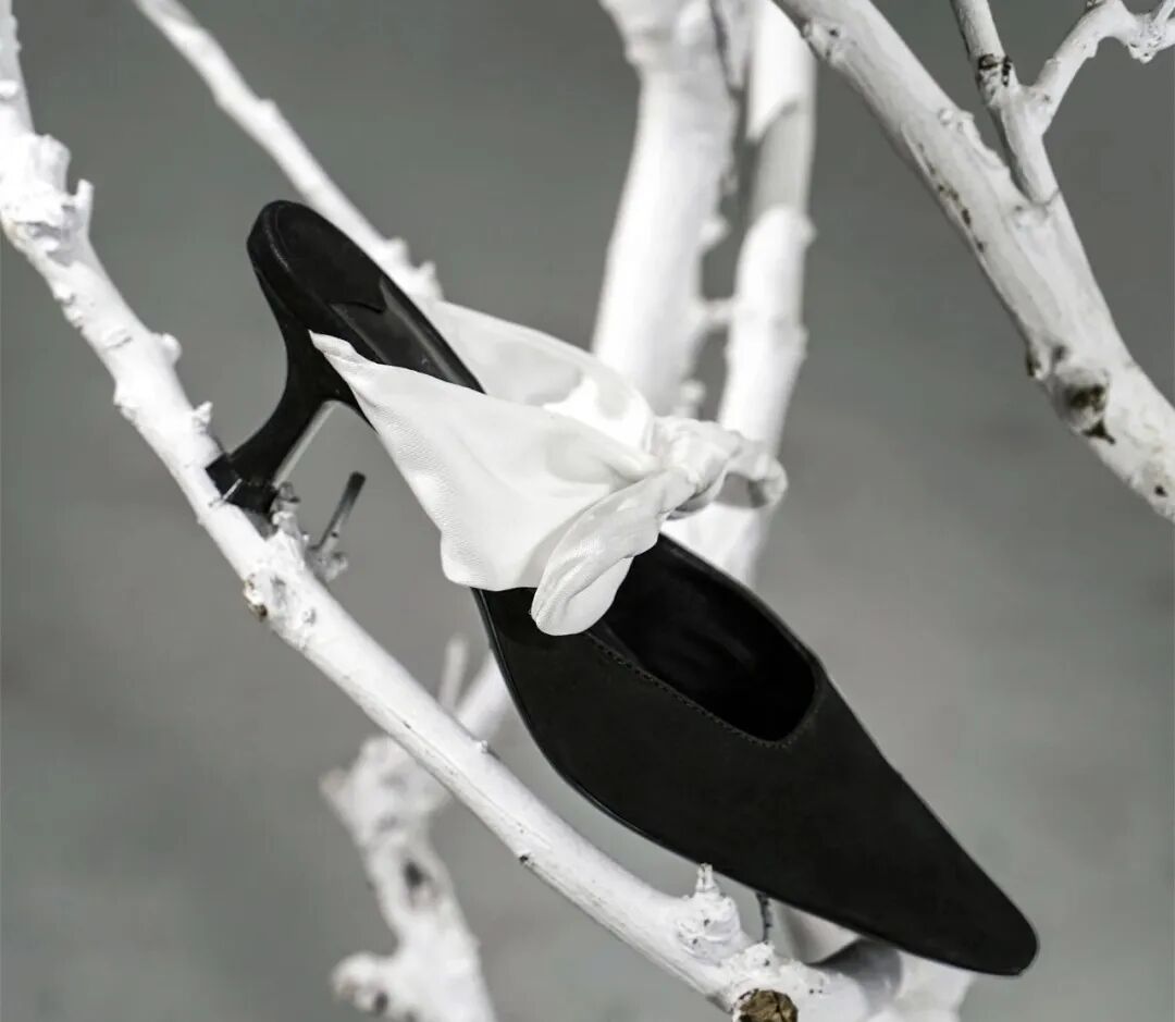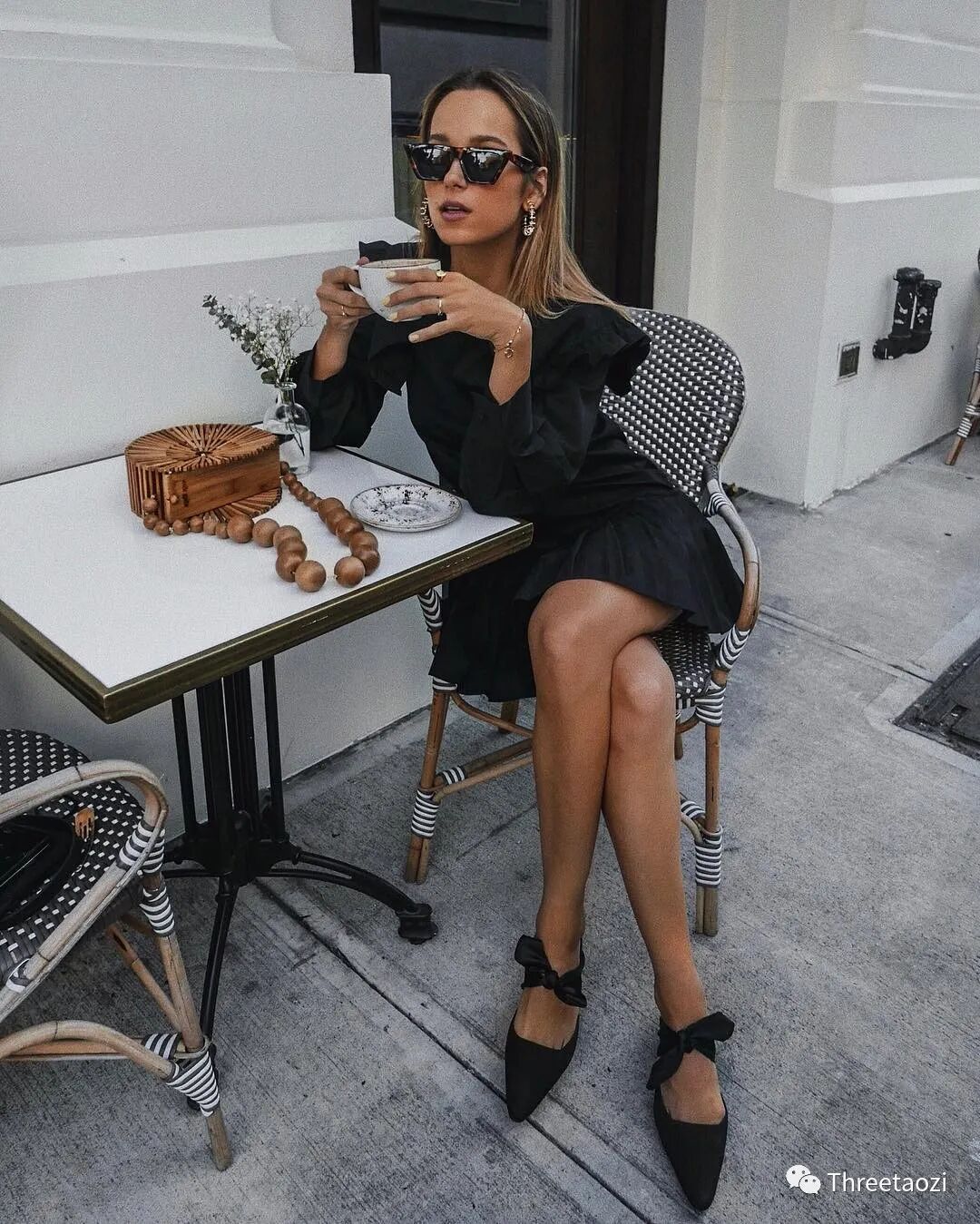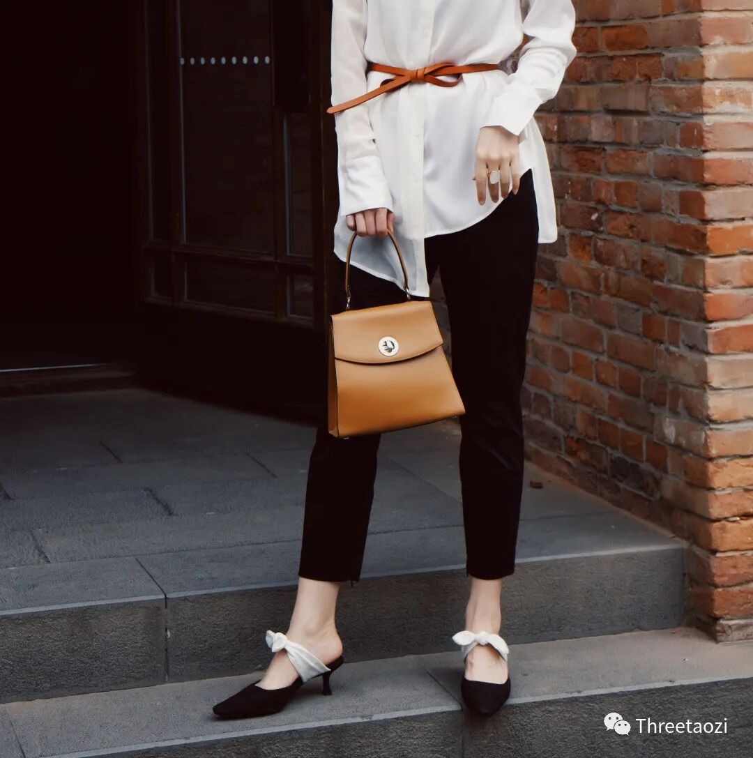 第一套Look我给它起名“黑白温柔职场风”,因为职场里到处都能见到黑+白,但大多严肃又老气。怎么打破呢?也有办法!我就用这双猫跟缎面穆勒鞋来实现。加一点亮色