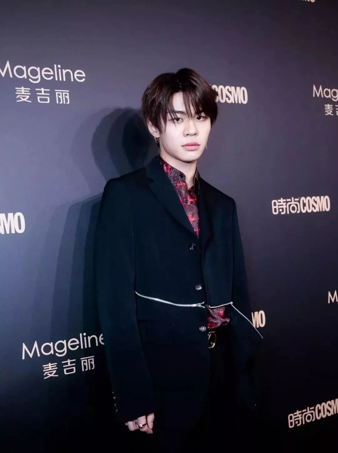 林彦俊就是当晚的“出色”NO.1,枫叶红套装魅惑霸气,若隐若现的锁骨实时上演着男性风情。
