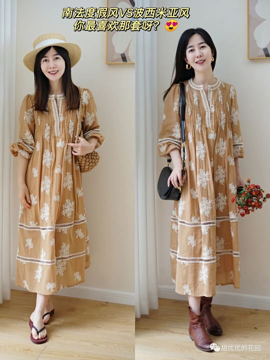 我最近入手了一条挺美的印花裙,随性宽松,颜色图案都是我喜欢的类型,正好用这条裙子的搭配,给大家分享一下,如何通过配饰的变化来打造不同风格的氛围感穿搭—南法度假风VS波西米亚民族风✨