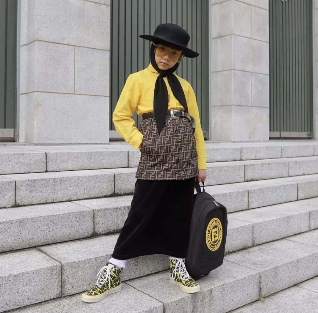 先来看看采访对象的一组穿搭,黄色衬衫搭配Fendi短裙,有趣的是,在短裙里还内搭了一条黑色丝绒长裙,头饰也完全不会突兀,完美地融合进了整个搭配中,色彩协调,干脆利落。