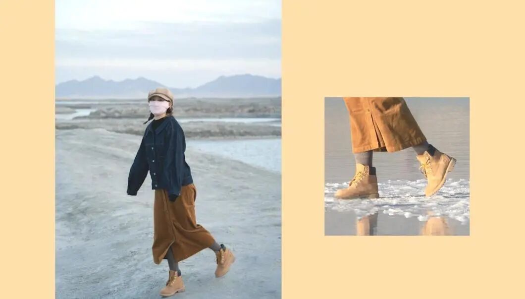 比如这次我选择的是大黄靴,袜子我就选择了深棕色的,这样看起来会更加和谐。
