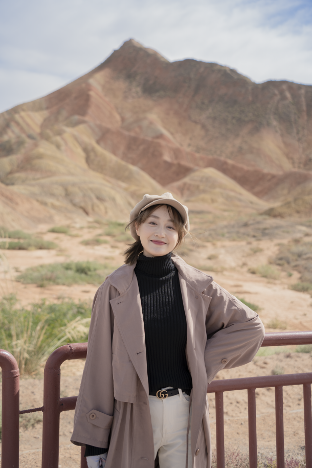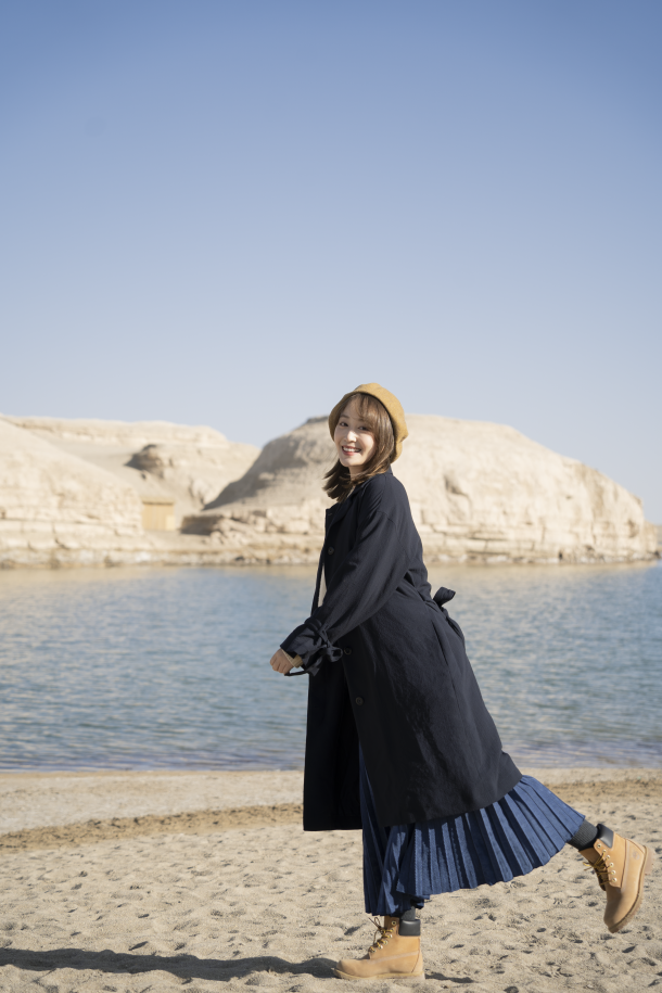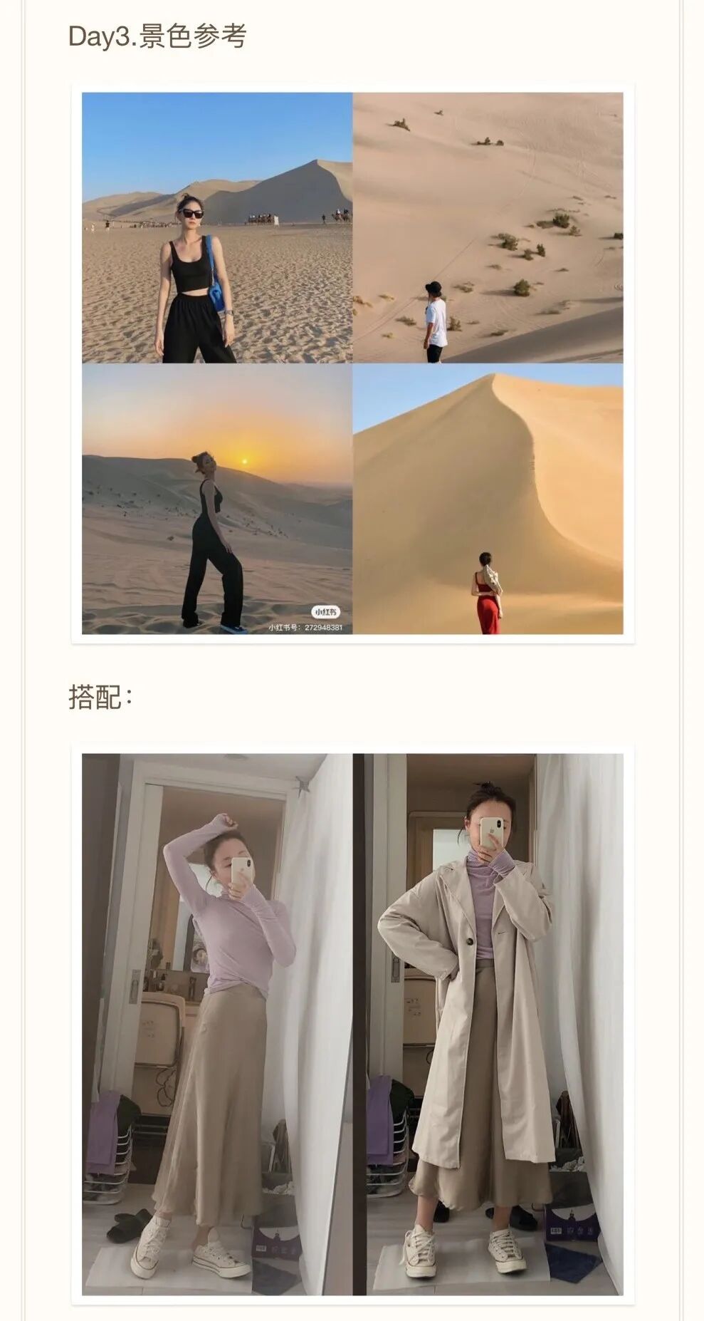 在撞色的时候,也要考虑到景点的风格。比如我去鸣沙山月牙泉的当天就穿了一个紫色的内搭,与沙地的温柔相呼应,拍出来的照片也是很有感觉的。