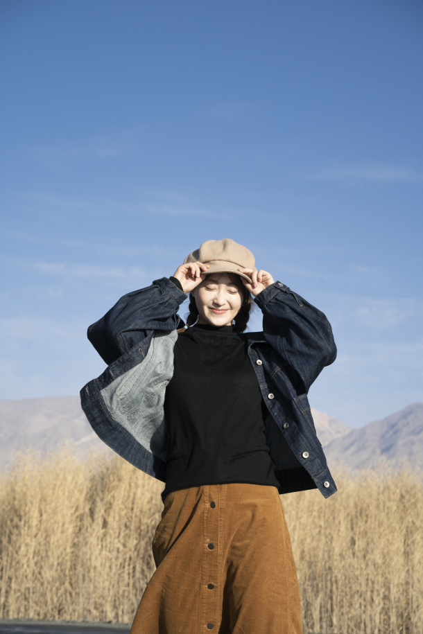 而且帽子还可以固定我们的发型,不管风怎么吹,帽子都可以保证你的头发能一直保持在一个很上相的状态,即使是风超大乱吹的情况,你会发现头发居然也是好看的,因为基本的形已经固定住了。
