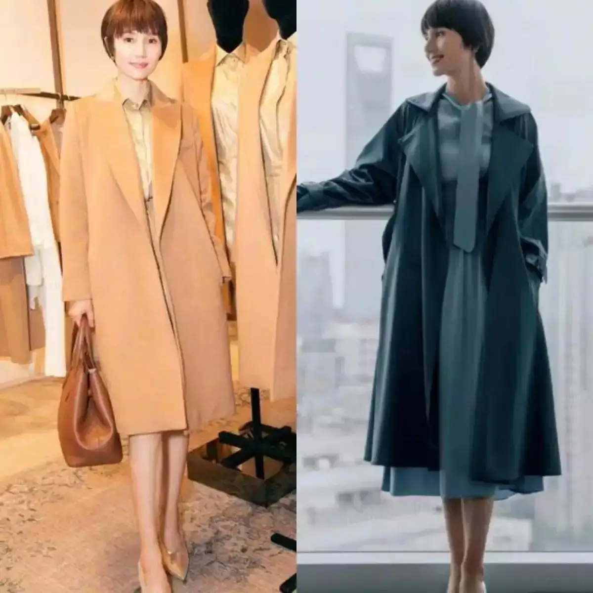 对于职场女性来说,我个人还蛮推荐大家选择西装裤来搭配的,因为西装裤面料穿在身上之后挺括有型,而且大多数西装裤的版型不会是紧身裤,例如下面右边的这位数位博主选择大地色的大衣外套,内搭格纹设计的灰色西装,内搭一件黑色的毛衣,下半身选择一条卡其色的西装裤来组合搭配,呈现出来的效果就特别的干练。