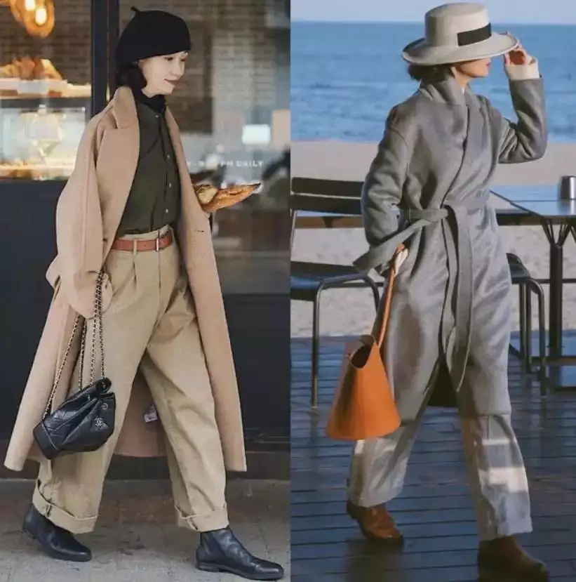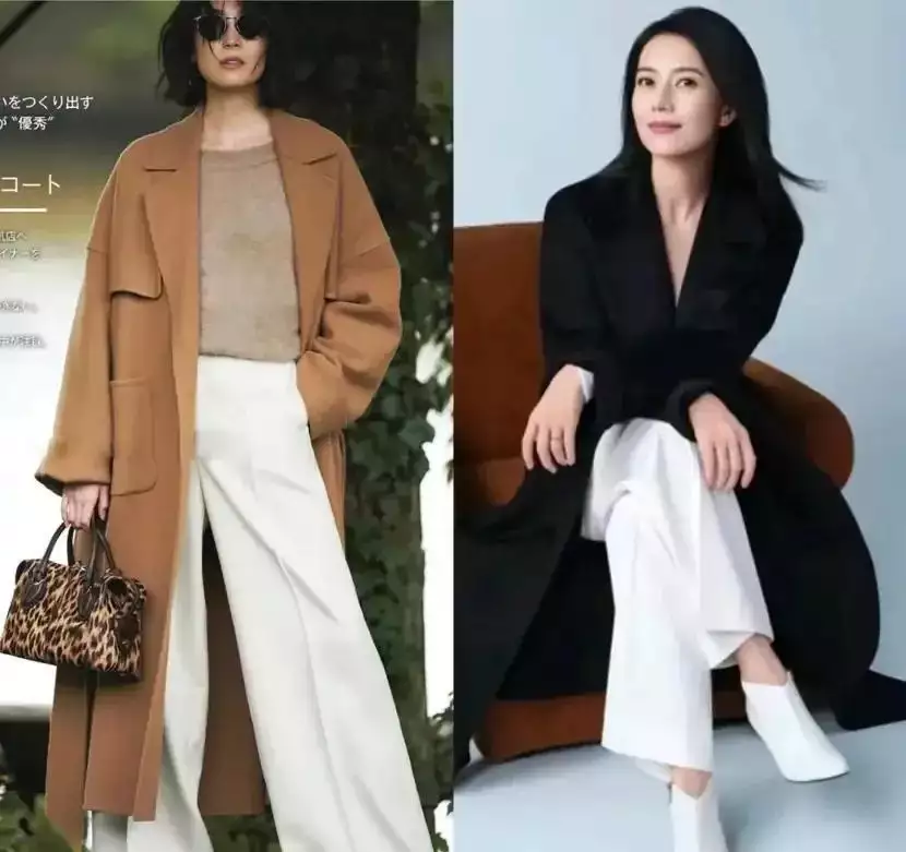 同时还蛮推荐大家选择白色的西装裤,阔腿裤来搭配的,例如下面这两套穿衣造型,用大地色的大衣外套搭配上白色的阔腿裤或者是黑色的大衣外套搭配上白色的阔腿裤,穿出来的效果都非常的经典耐看,可以说是谁穿谁美,不挑人,不挑肤色,更不挑年龄。