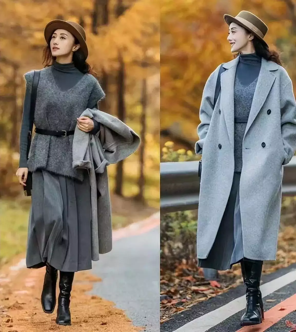 如果是高个子女性长相比较成熟的情况下,你还可以向下面这位博主一样,用一件灰色的大衣搭配上灰色的毛衣和打底衫,下半身也是用灰色的半身裙来搭配,脚上踩着一双黑色的中筒靴,虽然整套衣服的色彩属于灰色,但是深浅不一,这样穿出来的效果更有层次感,也更适合成熟女性穿出来,反而更有大气。