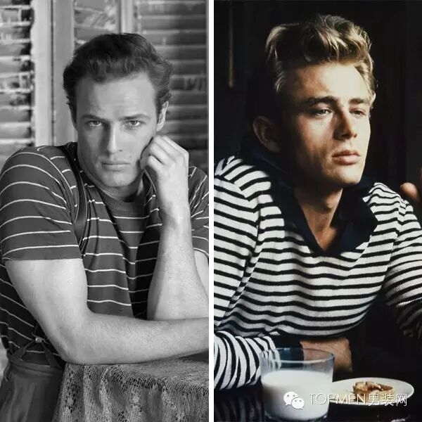 早在上世纪五六十年代条纹衫就已经很流行,热度完全不输纯白T。当时的演艺界小鲜肉马龙白兰度和詹姆斯·迪恩都经常穿,男神都穿还能不火!