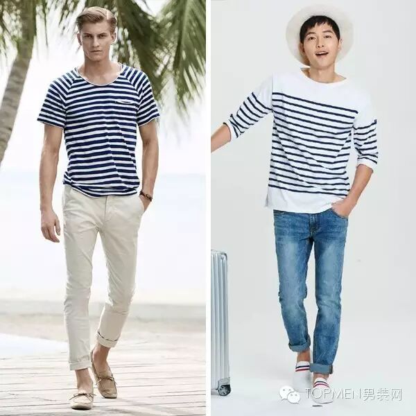 那我们就先从最直观的海洋风说起,一般来说海洋风就是要【清爽】,所以蓝白条纹的T恤是最适合这种风格。