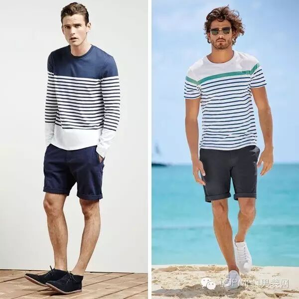 通常来说海洋风当然和短裤最配了,膝上10cm左右的百慕大短裤是最合适不过了。颜色的话最好选择色调同样清新的海军蓝、浅卡其、白色或者浅灰色。