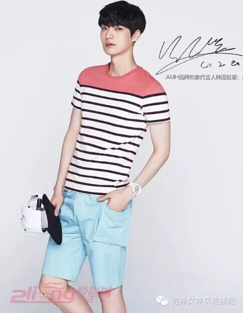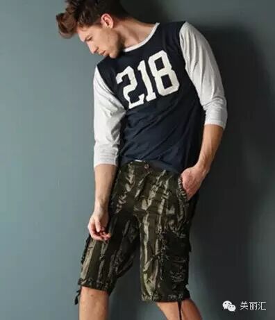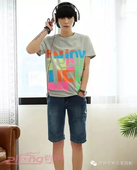 点评:简约不失时尚风的一款男生圆领T恤衫,搭配嫩蓝色中裤,很抢眼的裤子,完美诠释出帅气阳光的男生形象。