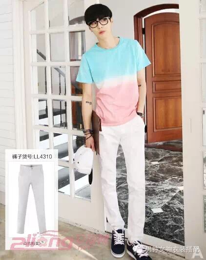 点评:充满梦幻色彩的男生圆领T恤衫,瞬间提升了你的白皙肤色,让你看起来更加的稚嫩阳光,搭配白色的休闲裤和黑色休闲裤,夏天这样穿很清凉时髦!
