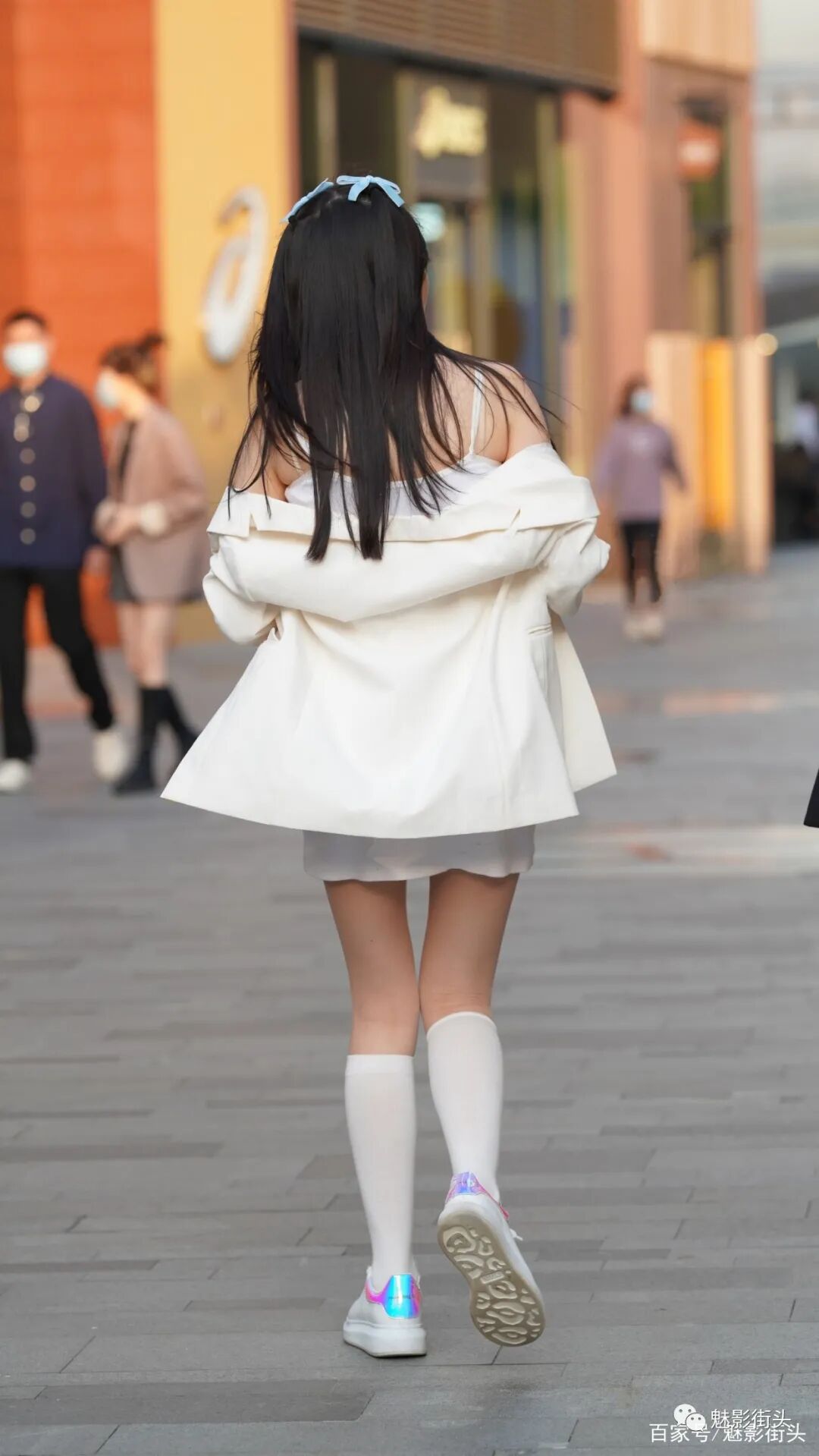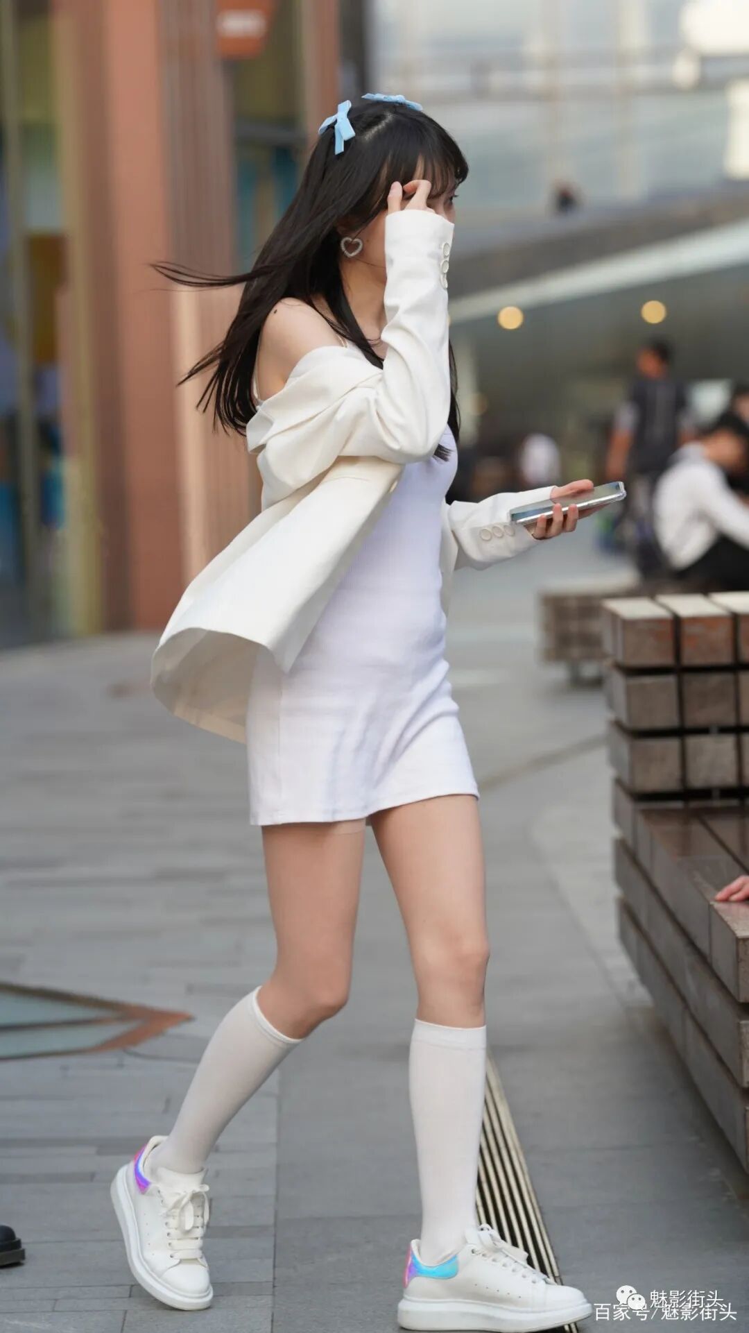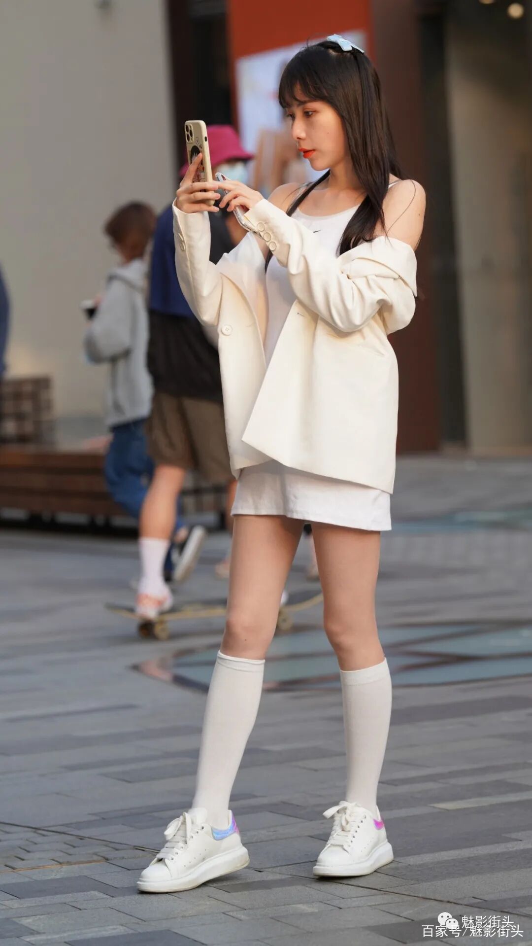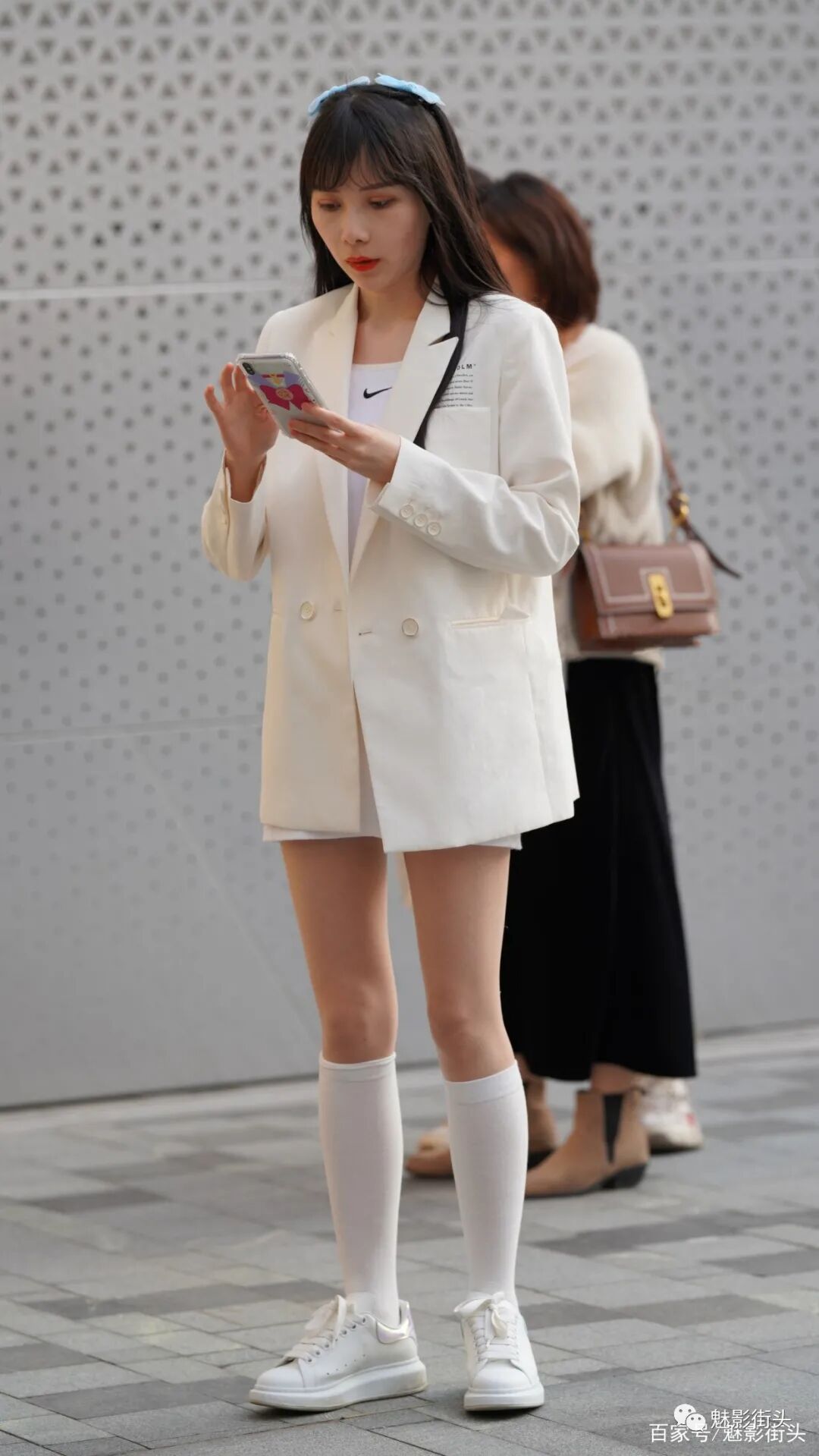 照片中这位年轻的小姐姐,她就采用了全身白色系的搭配,一件白色休闲西装外套,内搭一件白色针织吊带裙,敞开衣襟利用内搭来展示自己的身材。搭配一双带内增高设计的小白鞋,还有一双白色小腿袜,这样一身白色系的穿搭,减龄效果不错,在春天这样穿,获得了非常好的清新唯美效果,非常值得借鉴。