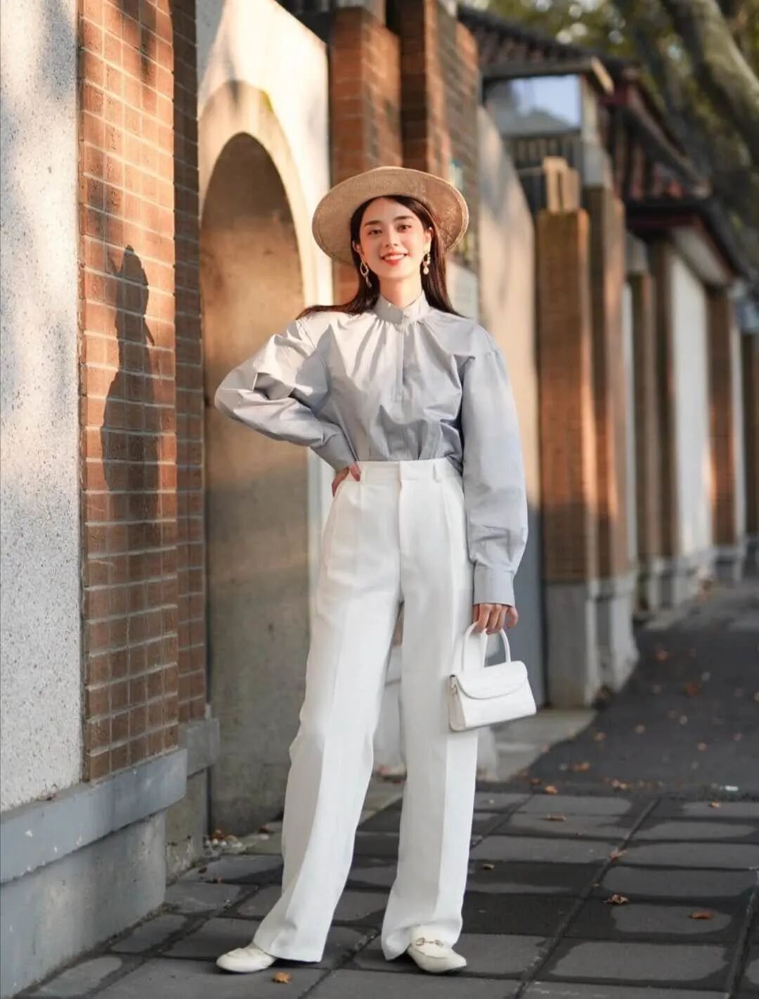 look1 水蓝色衬衫+白色高腰裤