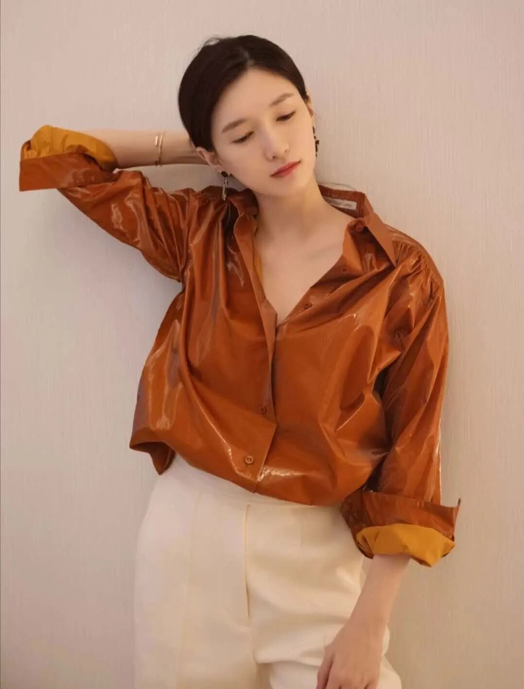 宝宝们,江江又来分享穿搭技巧了。漆皮衬衫如何在秋天不显得沉闷,一条白色修身的裤子,还有方形的耳环,让整个look都有复古时髦感。适当的金色配饰不抢镜,还有舞台感,我的心头爱。