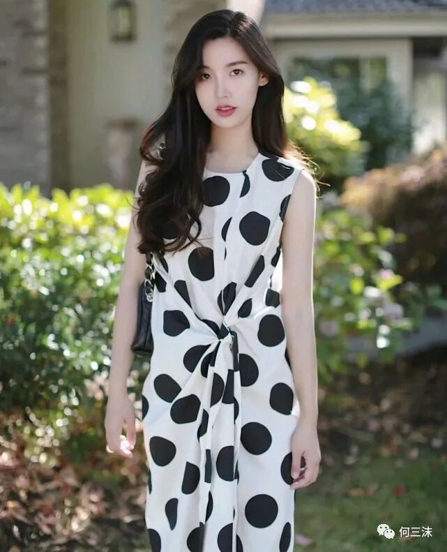 她所穿的连衣裙是以白色为底色,用偏大的黑色圆点来点缀,不仅避免了单调感,而且还很吸引别人的眼球,重点是这样的花纹设计不会给人一种很夸张的感觉。