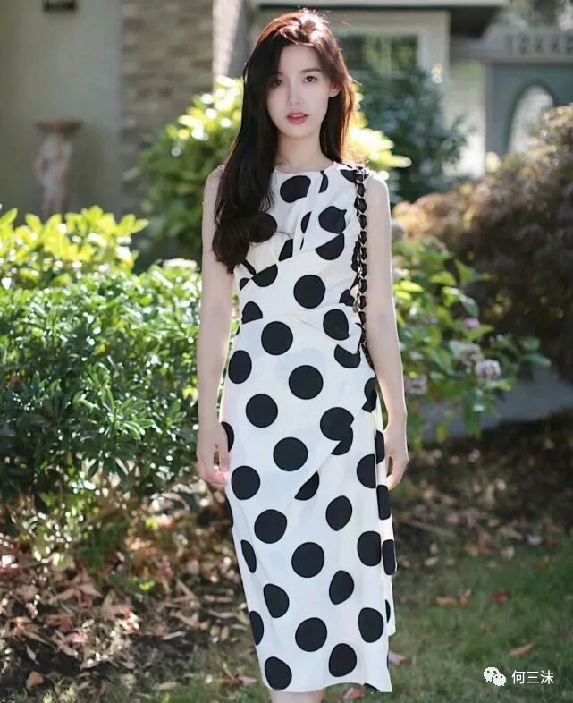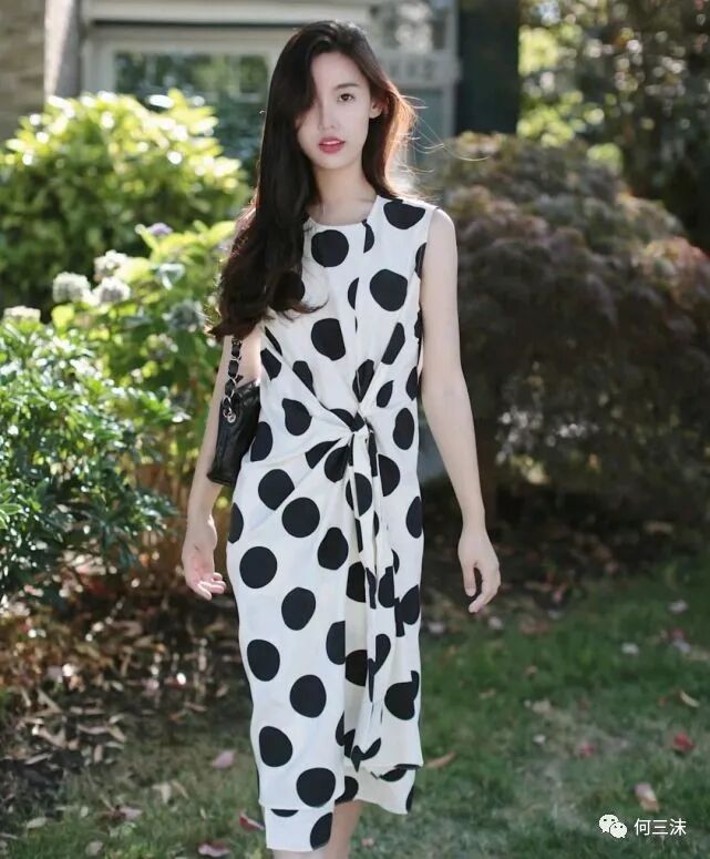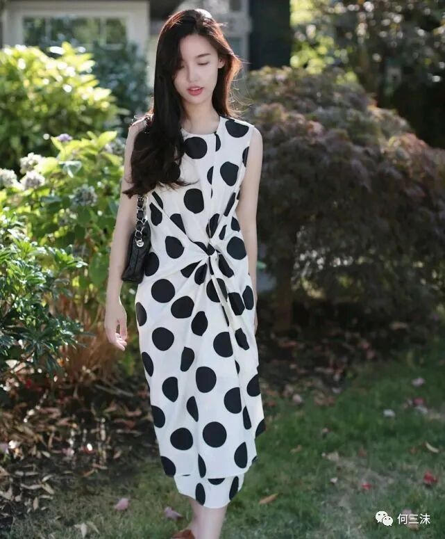 波点元素是很浪漫的时尚元素,虽然一眼看上去花纹很简单,但是只要选对了服装款式,会让人有种眼前一亮的视觉效果,就像这位时尚博主所穿的这条连衣裙就很精致,甚至很有女人味,并且大部分女生都可以轻松挑战。