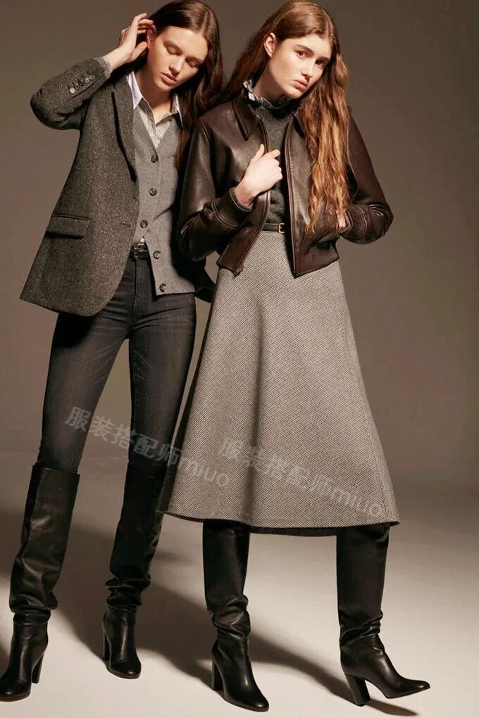 西装马甲+搭衬衫+A字中裙+连裤袜+高跟鞋,当然外面还可以加西装、加风衣、毛呢大衣等。