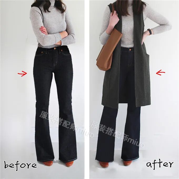 所以,无论是搭喇叭裤,还是小脚裤,甚至阔腿裤、烟管裤、中长裙,长款开衫马甲都会有非常显著的显瘦作用,并且令整体搭配更有层次感。