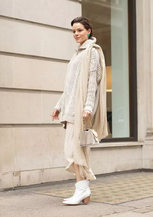在早春这个季节,比较常见的来举个例子就是上衣穿毛衣、西装,而下装可以穿纱裙,百褶裙,雪纺裙一类。