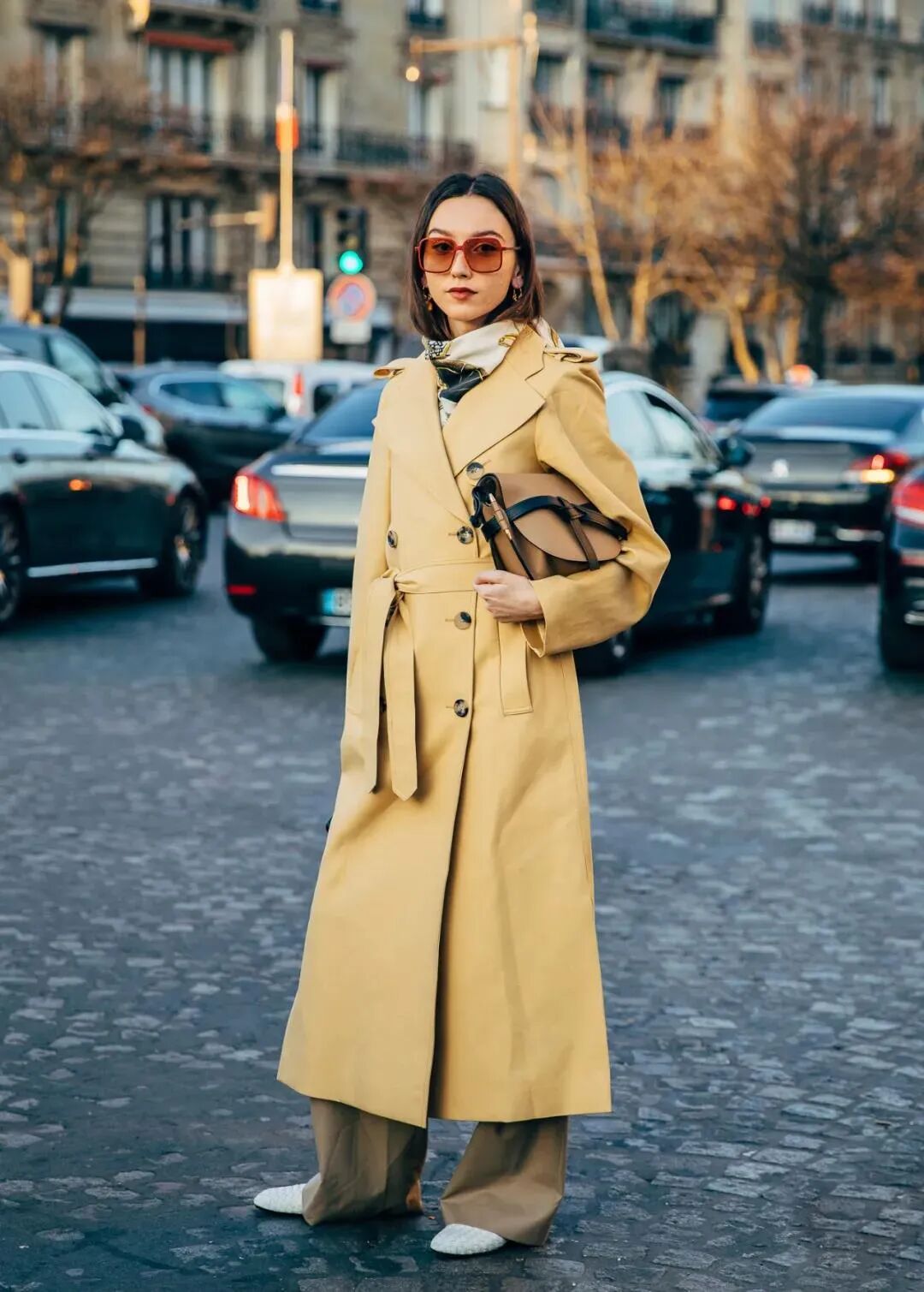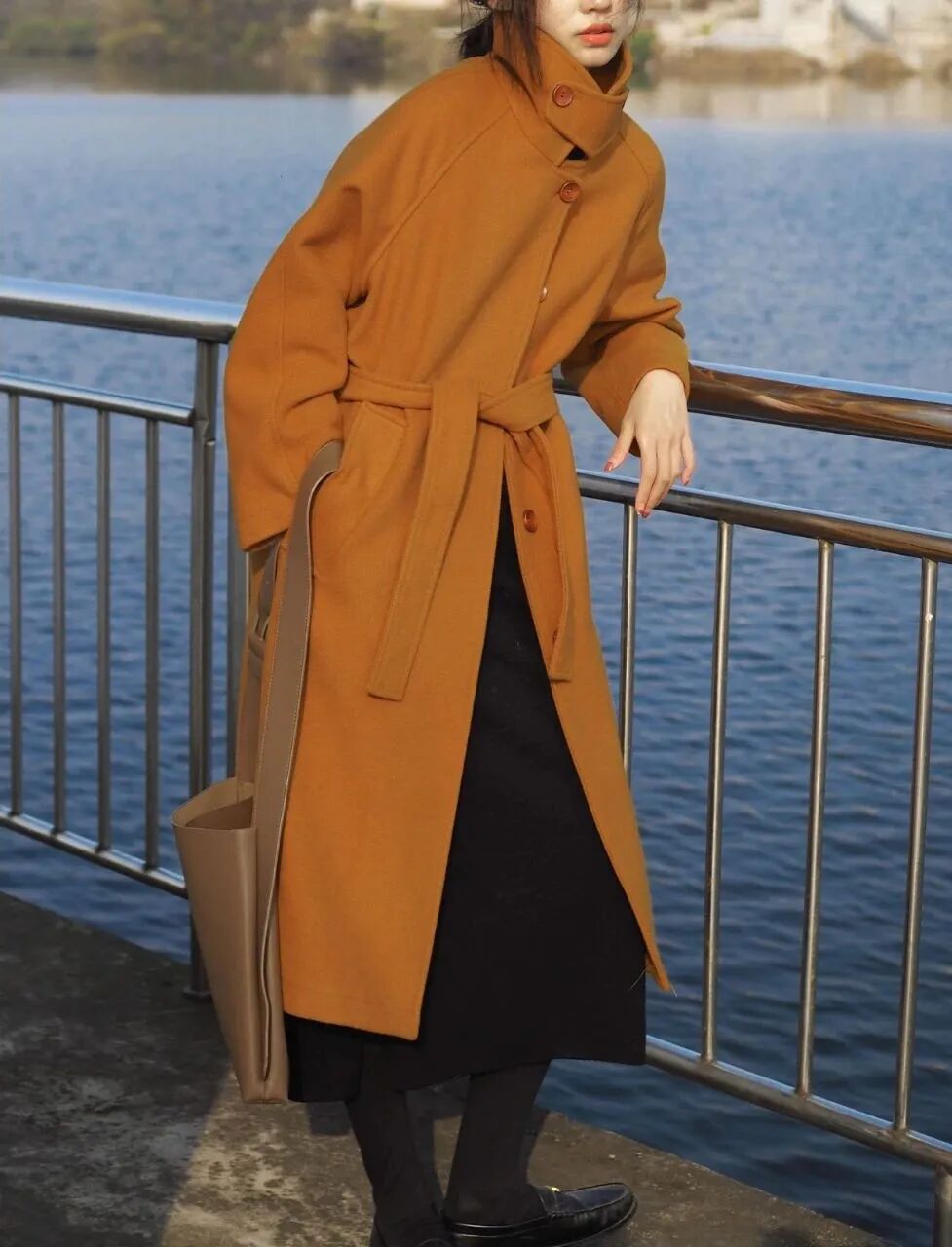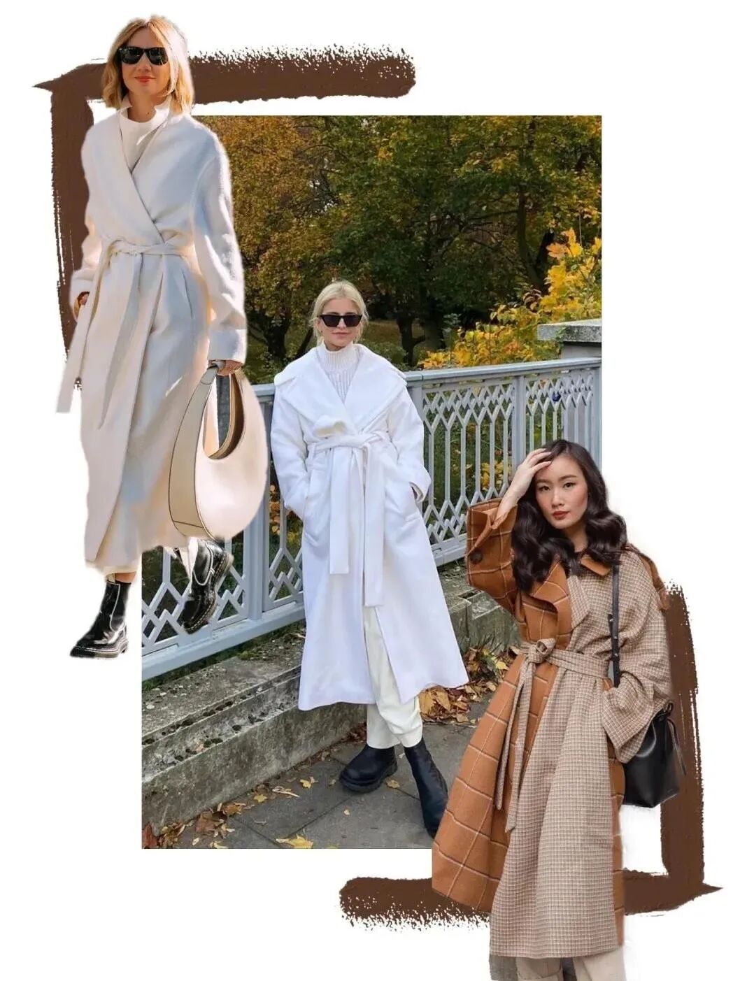 中长款对大多数人更加友好,长度刚刚好在膝盖上方。借用腰带系在腰部,营造腰线,既能修饰比例,也不会让你「淹没」在大衣中。精致又时髦。