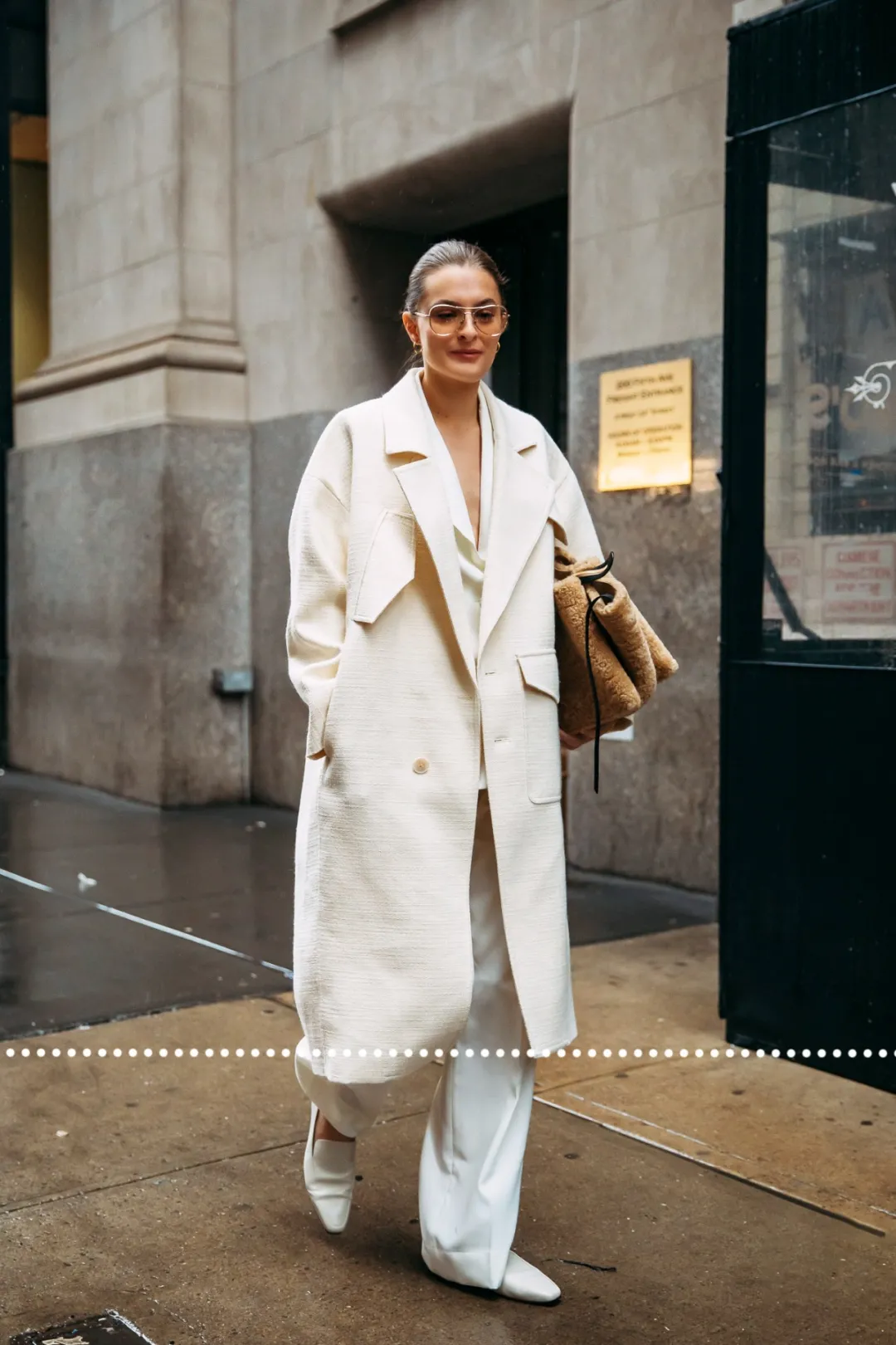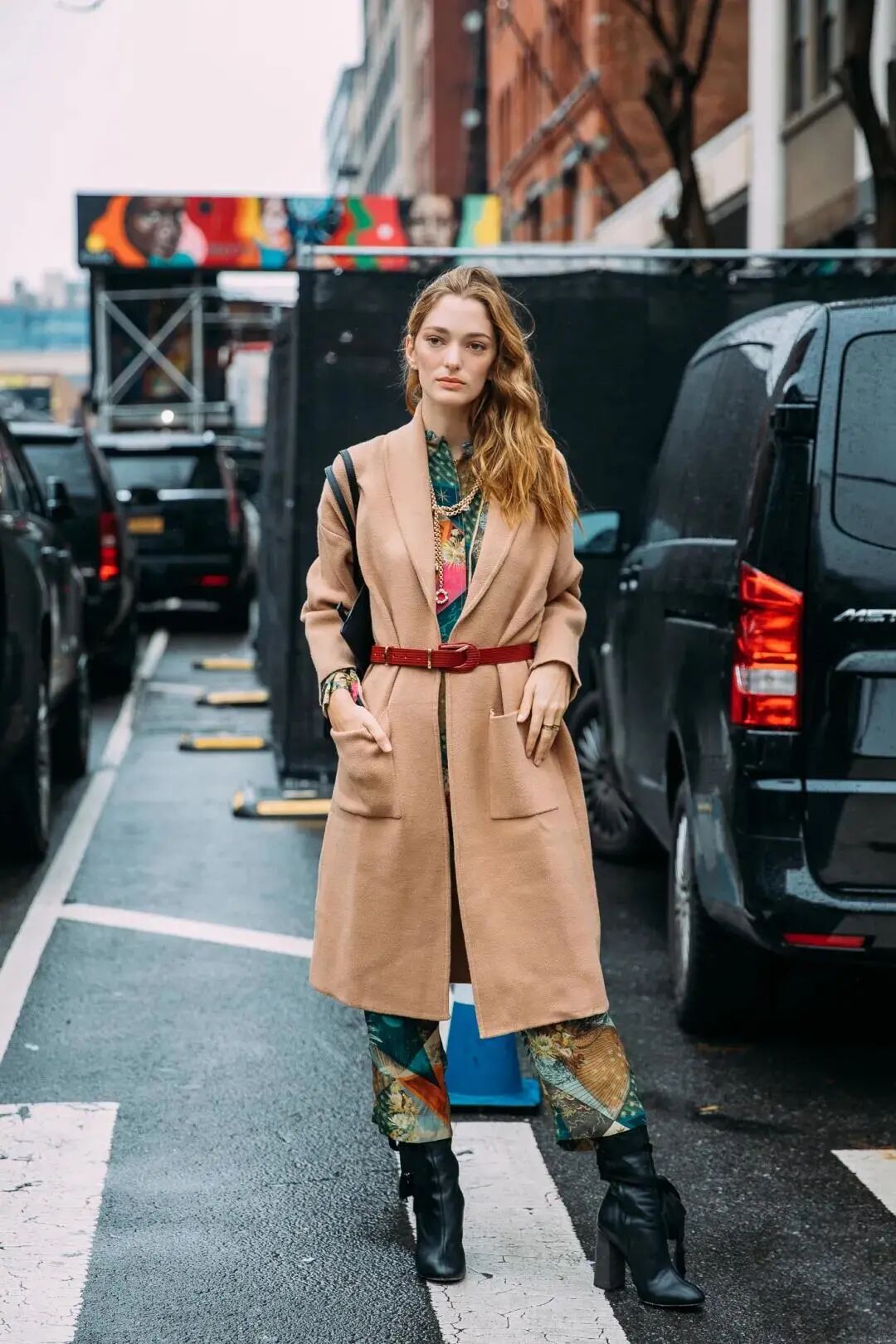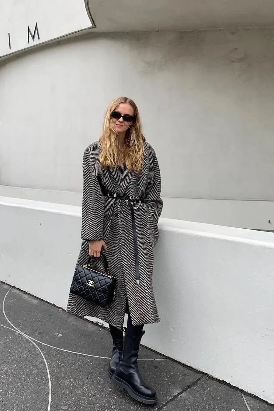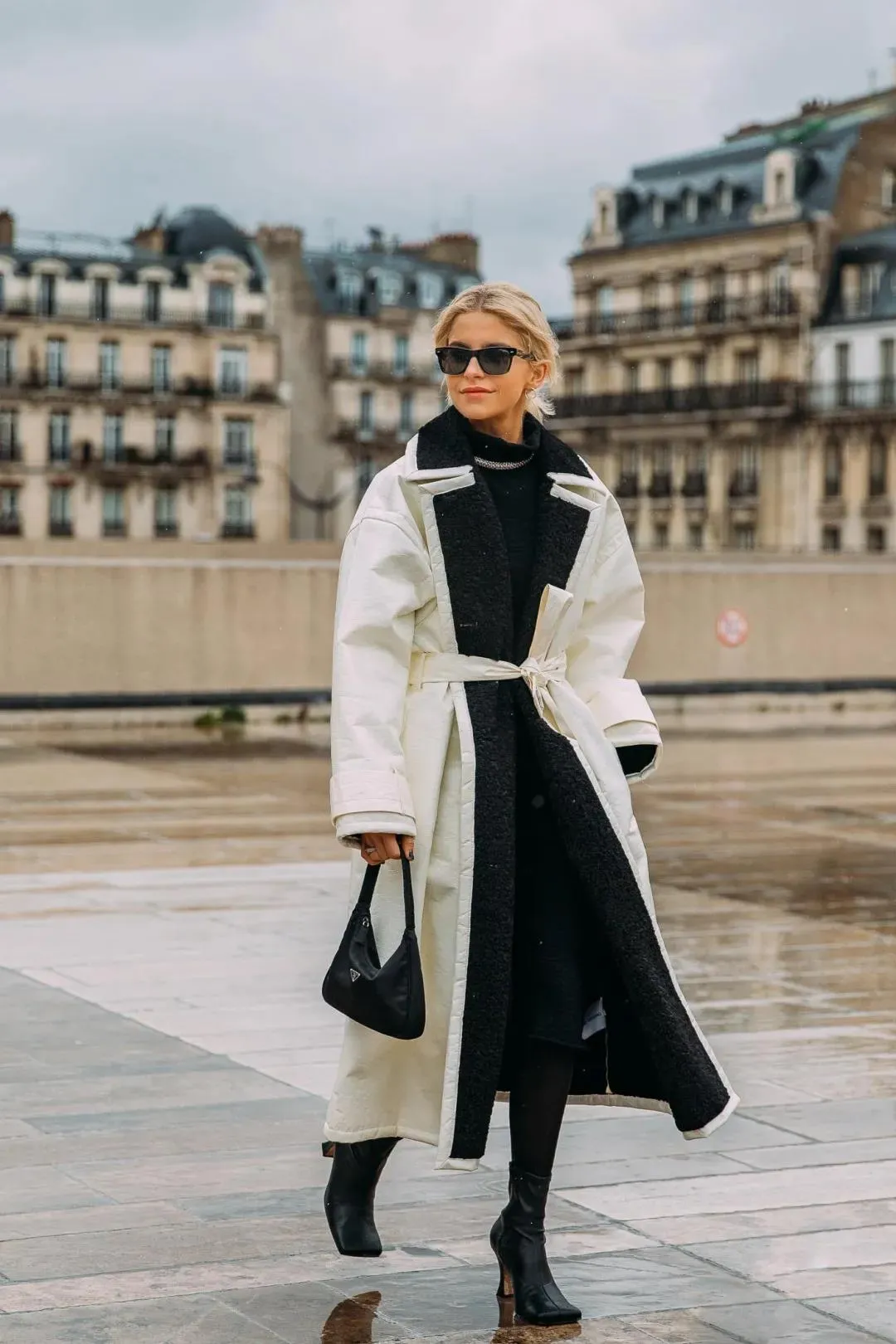 中长款对大多数人更加友好,长度刚刚好在膝盖上方。借用腰带系在腰部,营造腰线,既能修饰比例,也不会让你「淹没」在大衣中。精致又时髦。