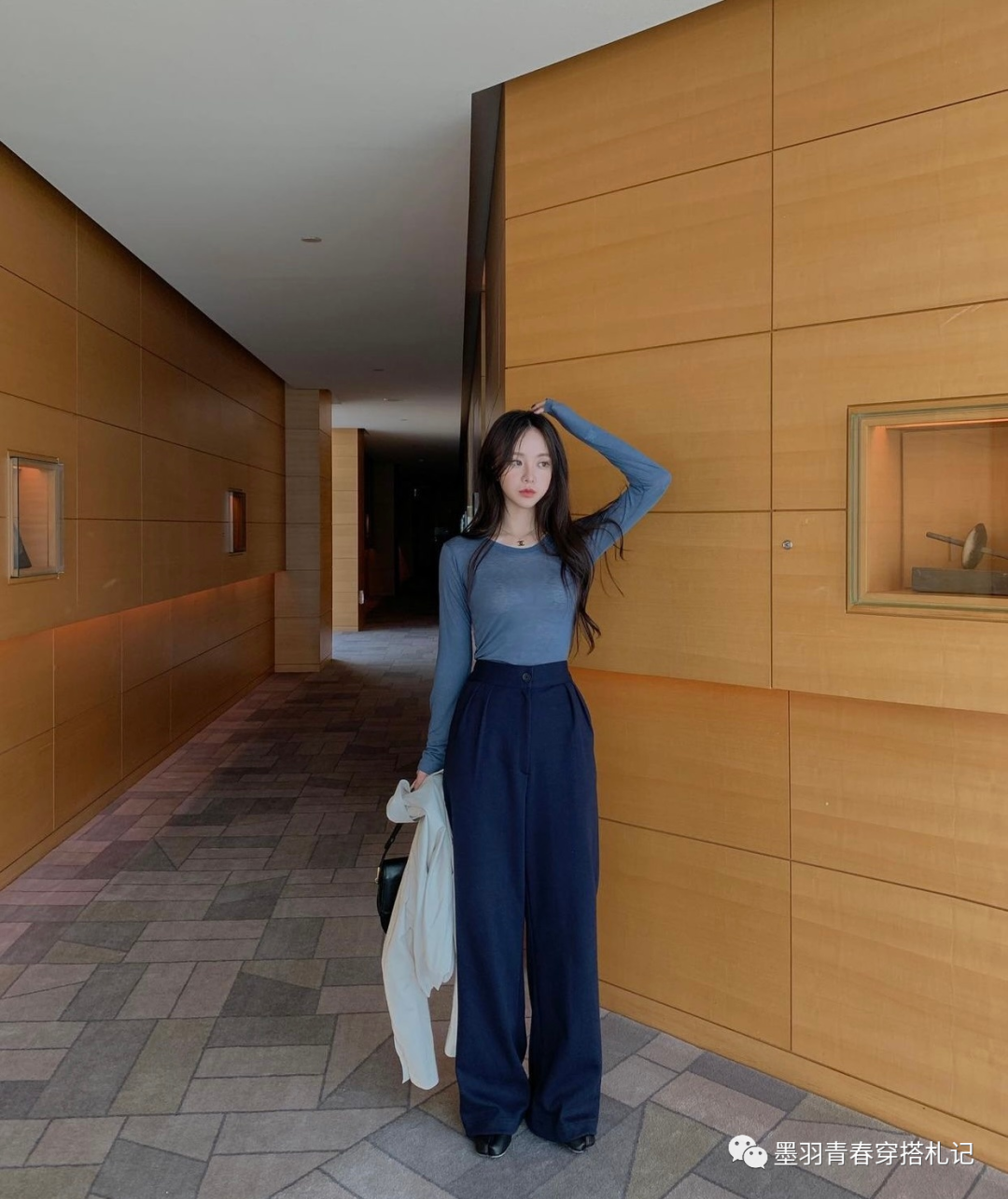 紧身的雾霾蓝针织衫,把这位小姐姐苗条和身形以及娇小的身材全部勾勒得淋漓尽致,隐隐约约显现出丰满的身姿,看上去尽显妩媚。下身是一款深蓝色高腰西装裤,拖地长裤配上黑色皮质猪蹄鞋,显腿长又很有个性。