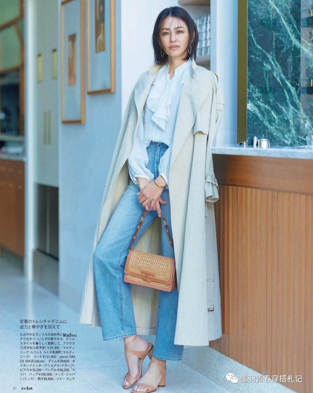 长款外套可以为成熟女性带来飒爽洒脱的气质,最为经典大气的代表单品就是这种长款风衣,米白色风衣外套和纯白色衬衫以及浅蓝色高腰裤极为搭配,再搭配上驼色编织手提包以及驼色高跟凉鞋,尽显优雅精致。
