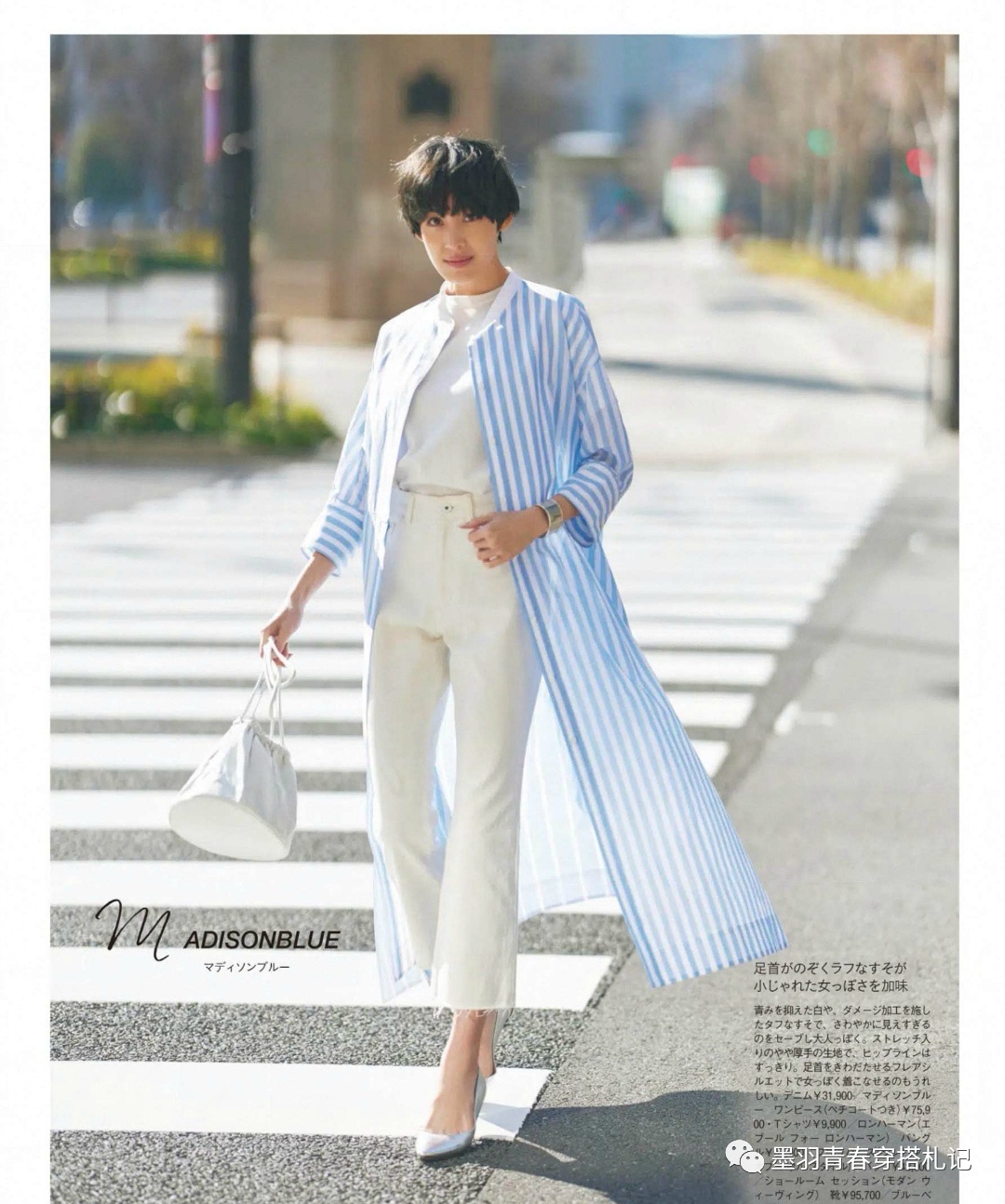 对于上半身骨架比较宽大的女生来说,选择上松下紧的搭配则容易暴露身材问题,此时上短下长的搭配显然是更为适合的。清爽又有个性的蓝白搭配在春日里面穿,尤为适合。这一套蓝白条纹衬衫,配上白色高腰西装裤的造型,干练利落,又达到了显腿长的视觉效果。