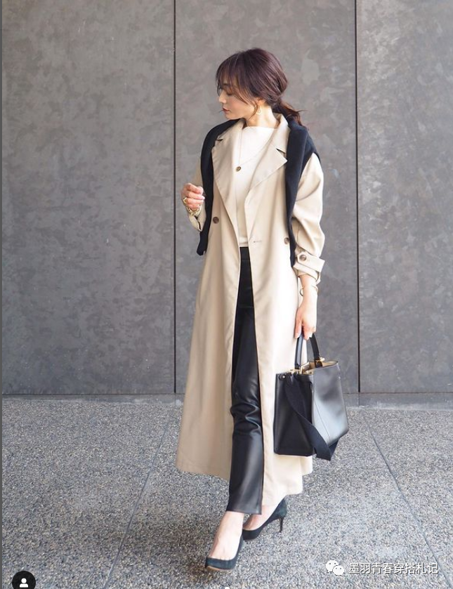 内松外紧的长外套搭配,有利于展现成熟女性身上的洒脱与干练气质,这款卡其色风衣搭配黑色紧身皮裤的造型,看上去就充满了气场,尽显利落大方。