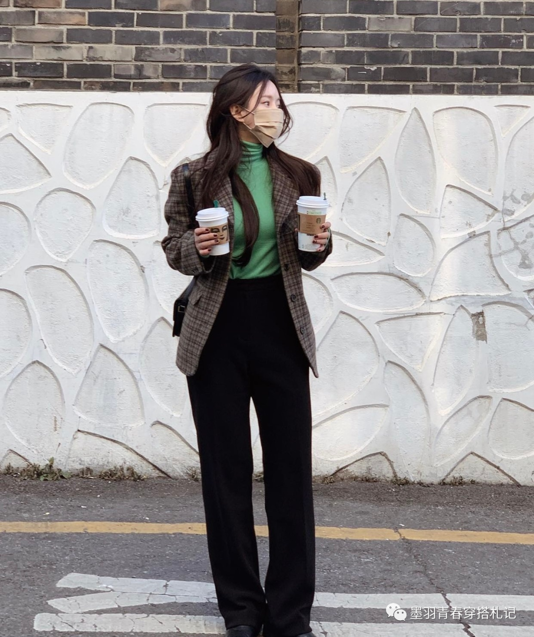 西装搭配当中,也同样可以套用这种上紧下松的公式,来显得腰身比例更加优越。用一条黑色高腰西装拖地裤,配上轻薄的绿色打底衫,就能营造出三七分的身材比例,外面搭配一款深棕色的格纹西服,既有复古感,又很时髦。