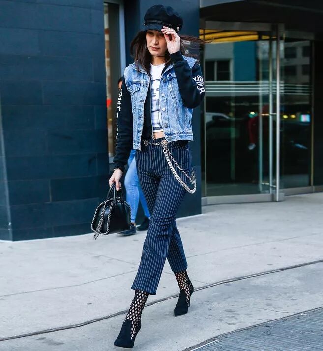 上身穿条纹针织衫,下身搭配牛仔裤,