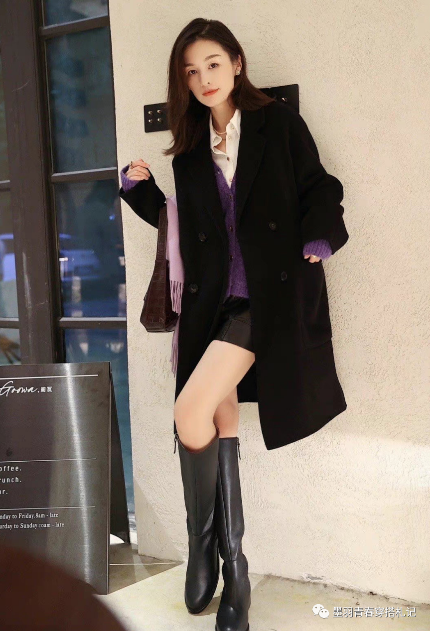 短裙和长大衣也是绝配。黑色的呢子大衣里面配一件紫色毛衣和白色衬衫,叠穿很有层次感。搭配一条黑色皮裙,脚踩一双黑色长筒靴,露出了绝对领域,上街保管回头率爆棚。