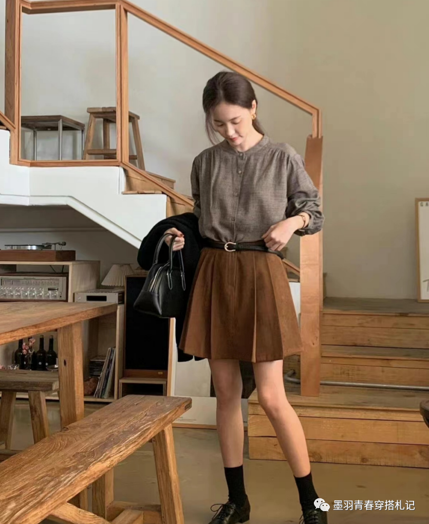 如果你的腿足够纤细,像这种百褶款式的短裙也可以驾驭,只不过对于到了一定年纪的女性来说,穿短裙颜色不能花里胡哨,像基础色就很好,棕色+灰色上衣,简单又大方。