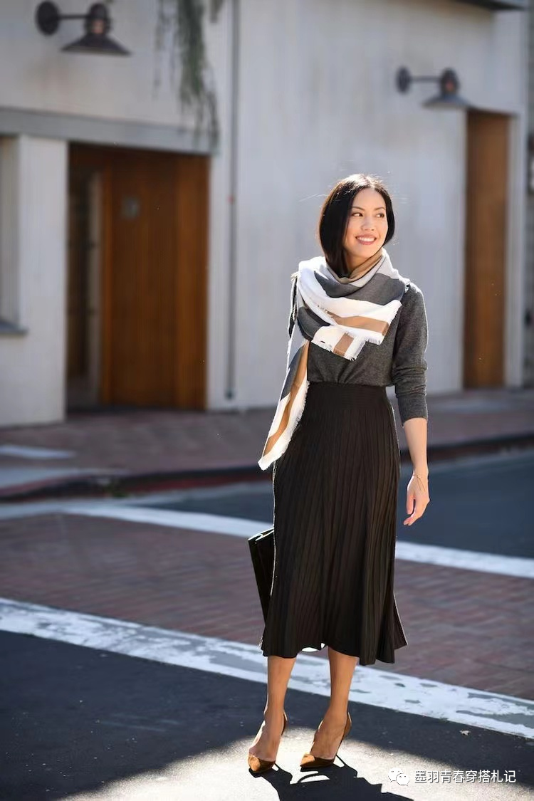 针织褶皱半身裙也很有成熟的味道,搭配灰色针织衫,很有职业女性的感觉,如果你觉得颜色过于沉闷,可以搭配一条撞色围巾作为点缀,真的很优雅有气质。
