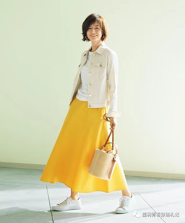 这套装扮很休闲,明黄色的半身裙很亮眼,一下就能被抓住视线。白色内搭和牛仔外套清爽,风格飒爽干练,半身裙露出了一截脚踝,搭配小白鞋,凸显优雅高级。