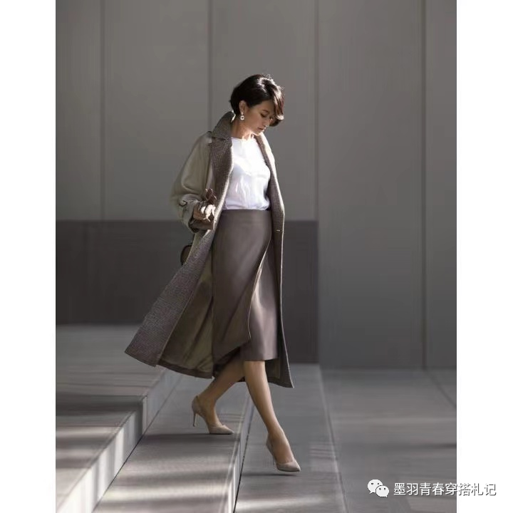 过膝长裙真的是优雅女性的代名词,女生一定是到了一定的年龄,穿长裙才更有味道。这套装扮中,白色上衣搭配一条一片式灰色长裙,走动之间裙摆摇曳,非常有流线型的美,外面是一件灰色大衣,长度没过膝盖,很有层次感。