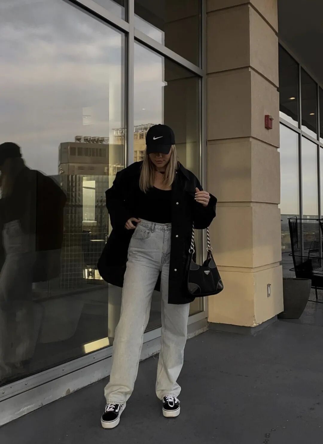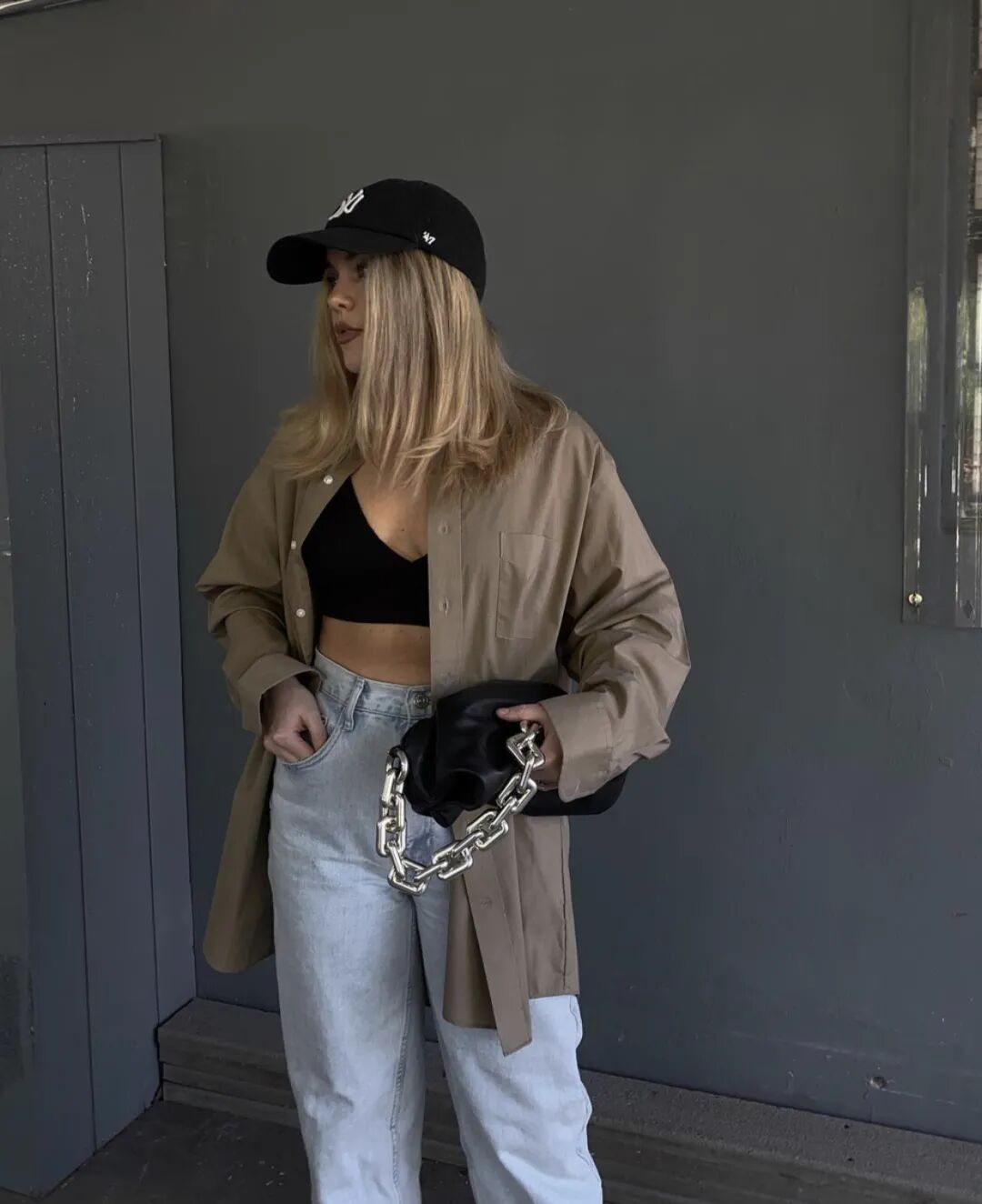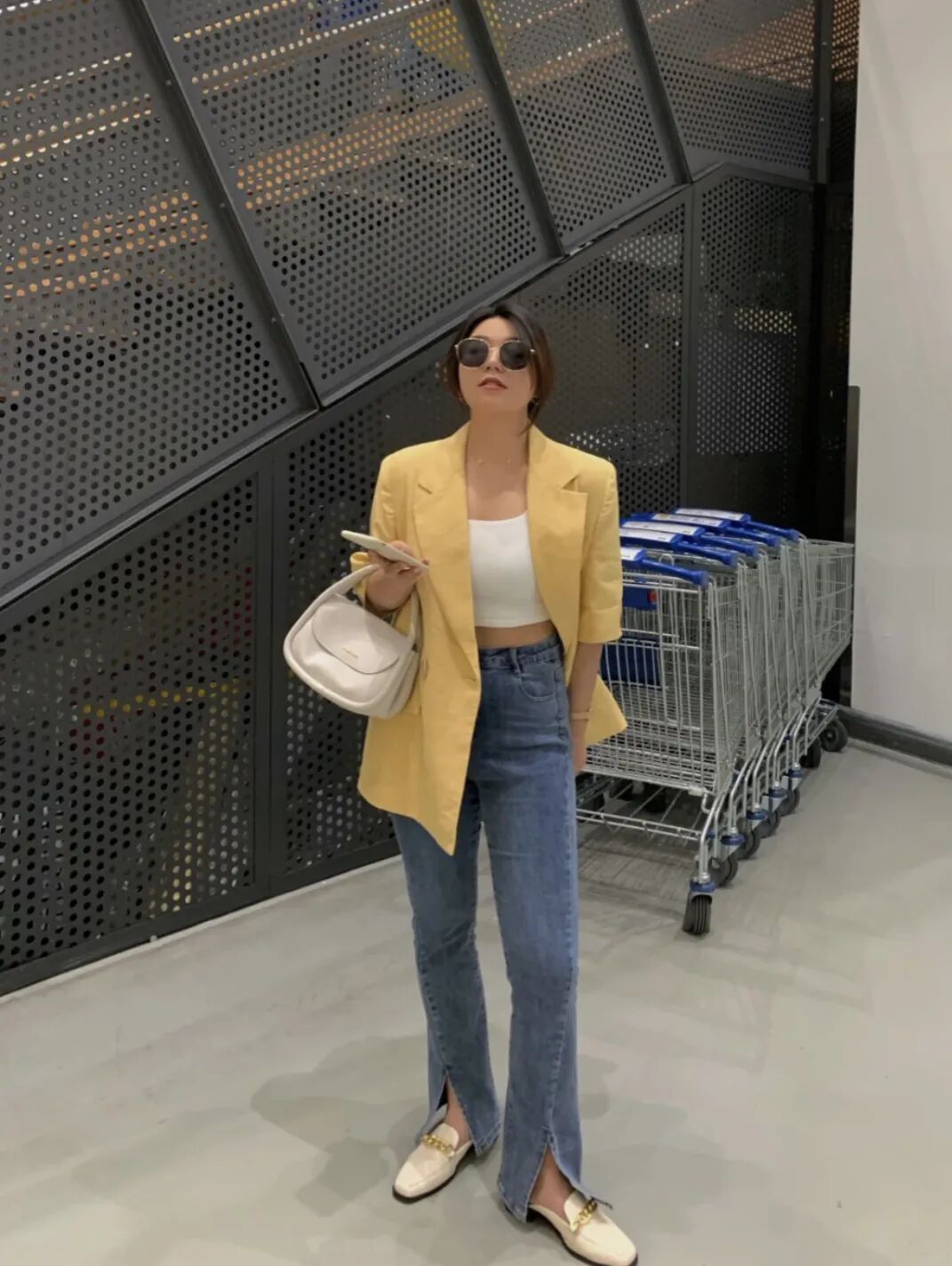 对于裤子的选择,像missjoslin除了休闲裤,在穿牛仔裤时会选择与双腿间,留有一定空隙的版型,视觉上会显得下半身比较匀称~