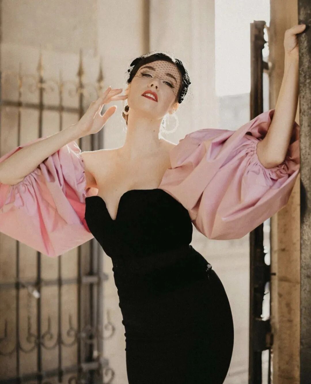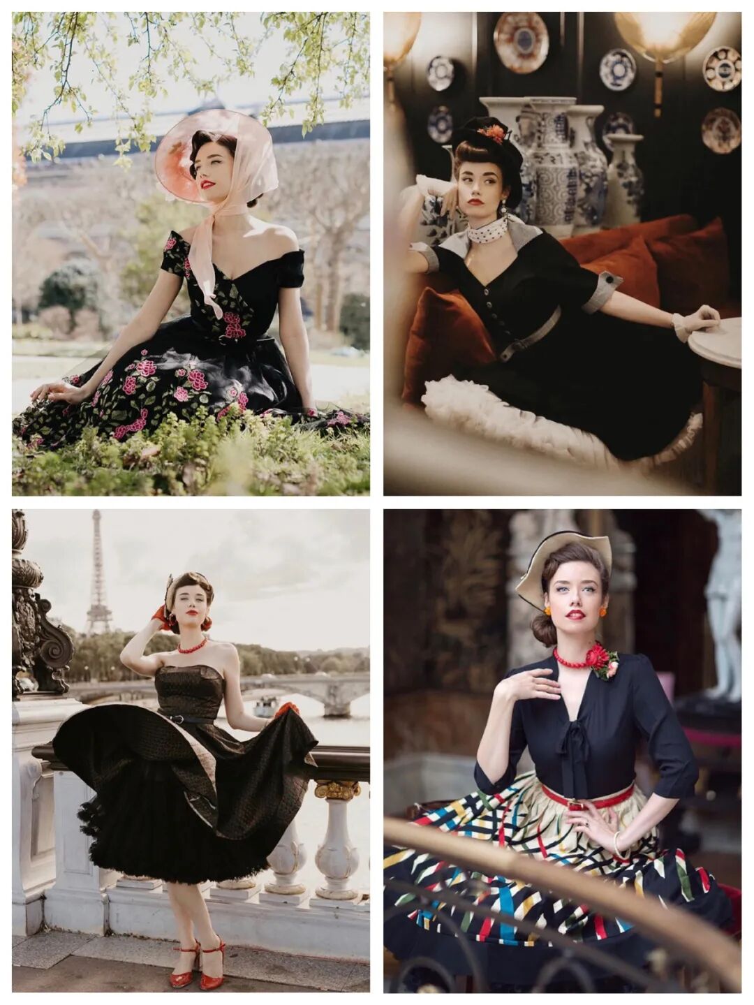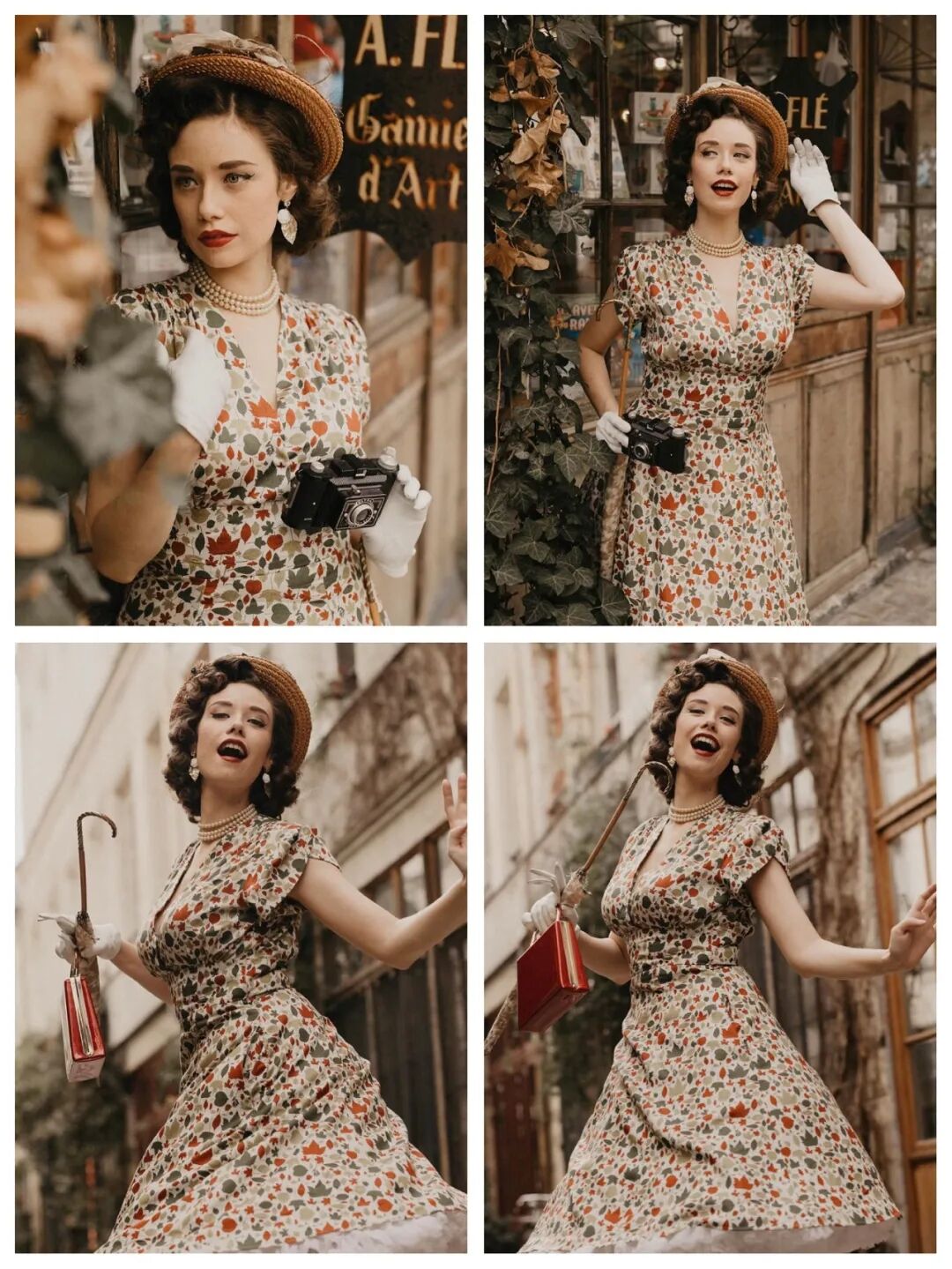 复古卷发+复古礼帽是她的标配,花卉装饰、珍珠项链、白纱手套一个都不能少。