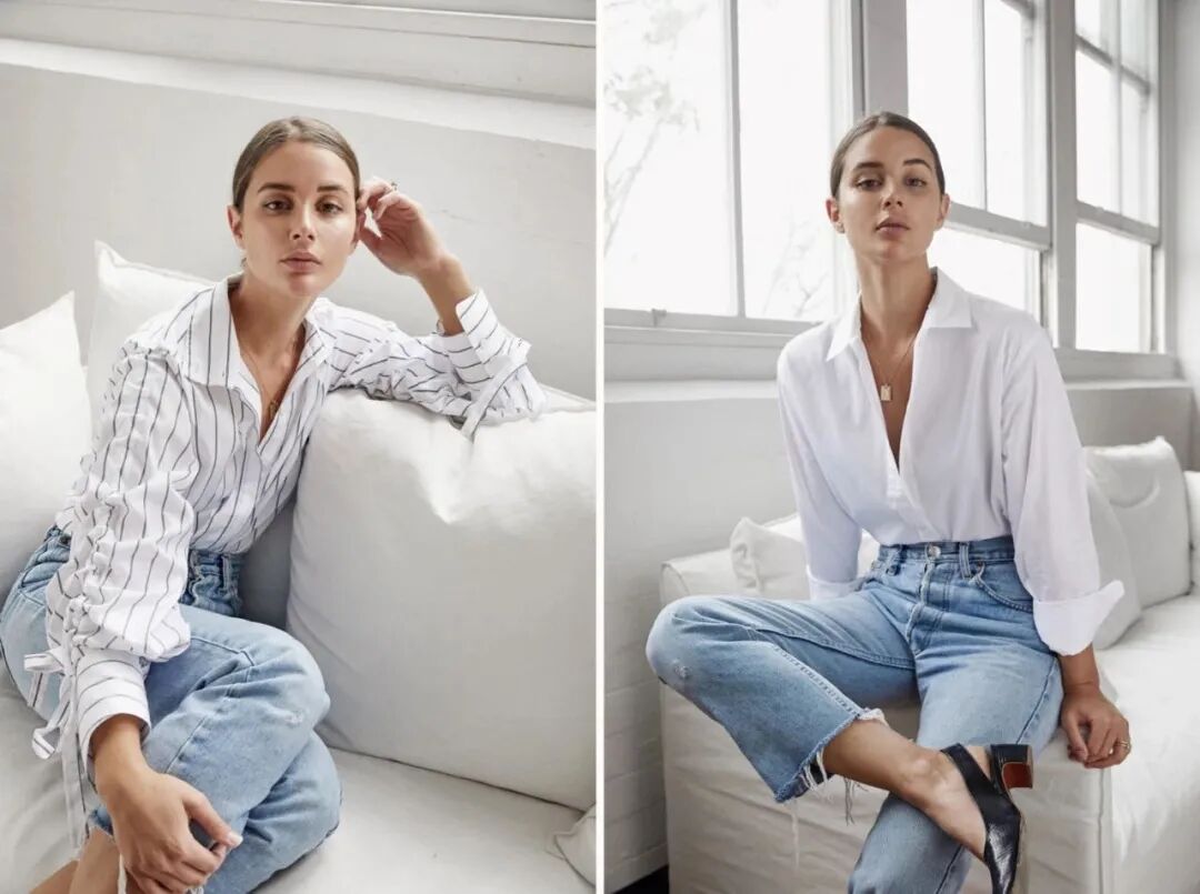根据不同风格选择不同开口的衬衫,v领偏性感,方形领偏古典。