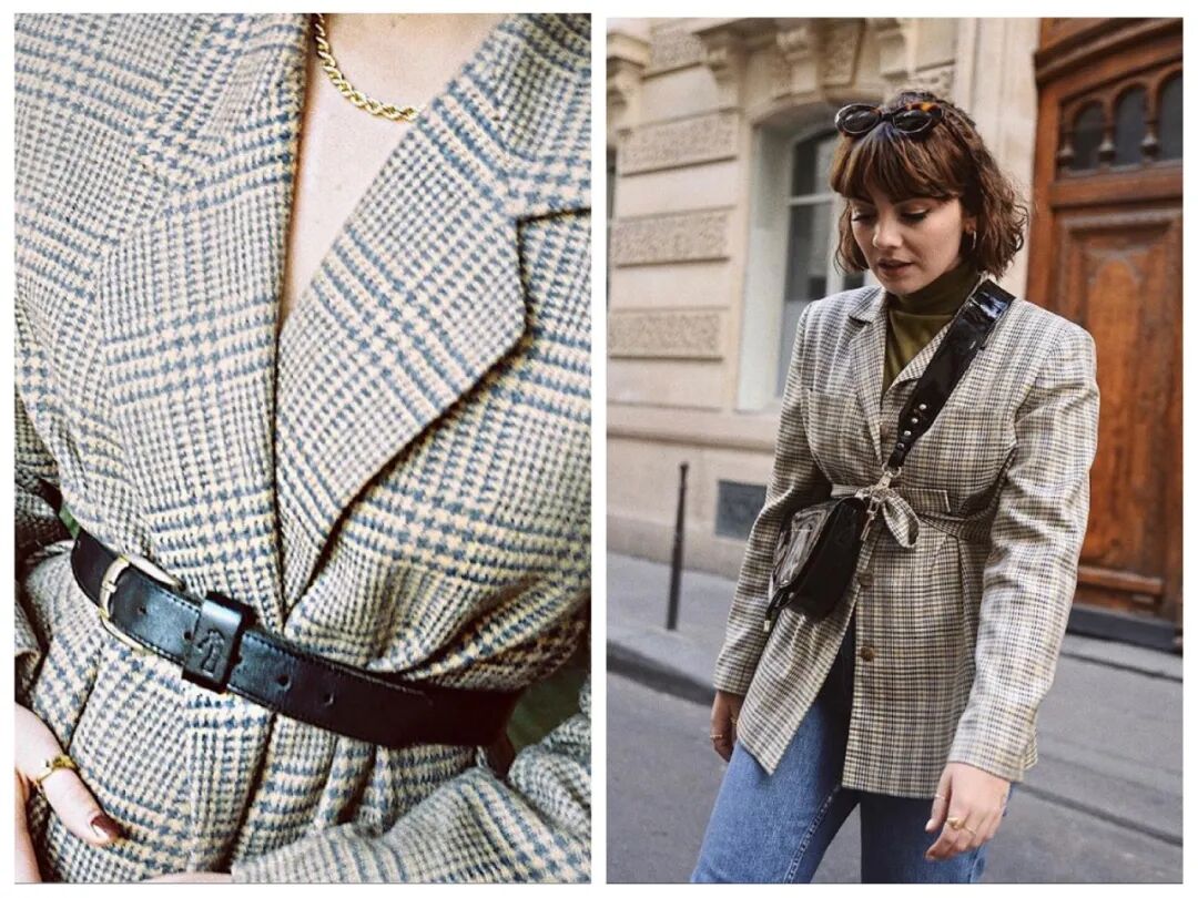 又或者是选择格纹元素,大量竖向切割,用小巧的窄腰带提高腰线。