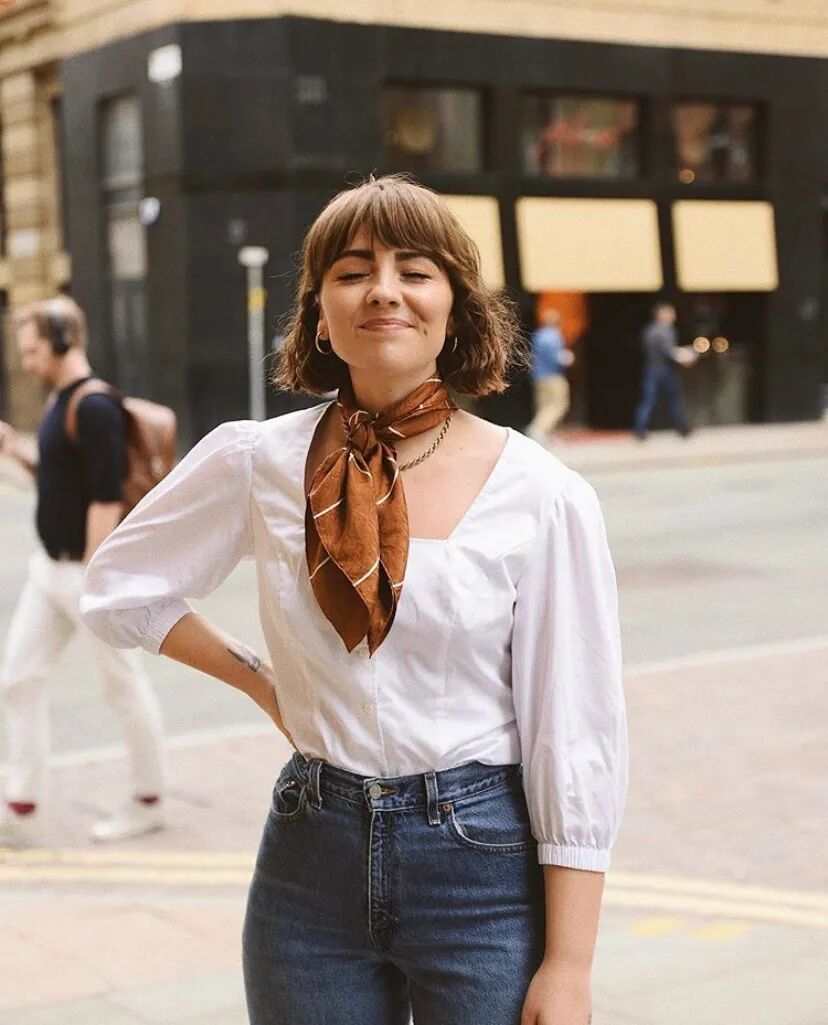 待到天气再冷点时,小方巾与深v衬衫的搭配也很实用。