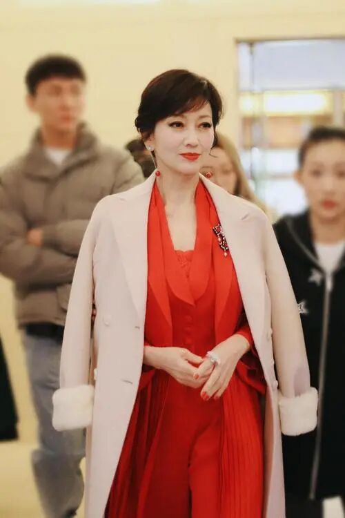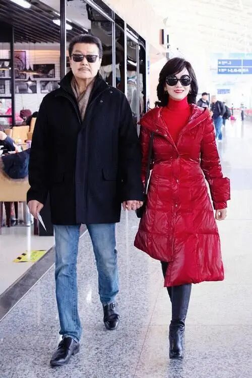 红色羽绒服搭配红色高领毛衣,赵雅芝这套羽绒服穿搭采用的是“同色系”搭配技巧,非常喜庆。