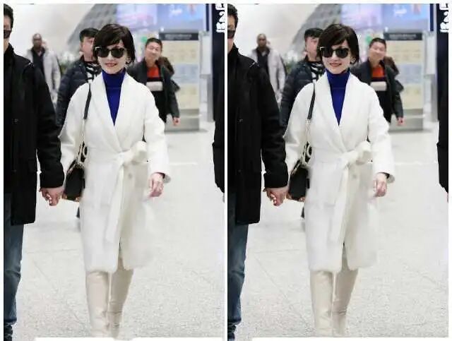 白色在秋冬季节穿非常显眼吸睛,毛绒绒的材质也非常软糯显得整个人非常温柔,而浴袍形式的基础款版型则包容有质感,内搭深蓝色高领毛衣,复古又显气质。赵雅芝利用一条白色腰带将大衣的腰线束起来,凸显出女性身材的曲线感。而杏白色的皮质长靴则和大衣颜色相呼应,精致又显高挑。