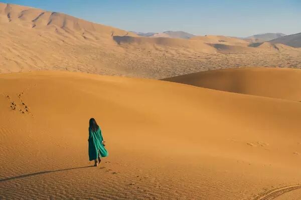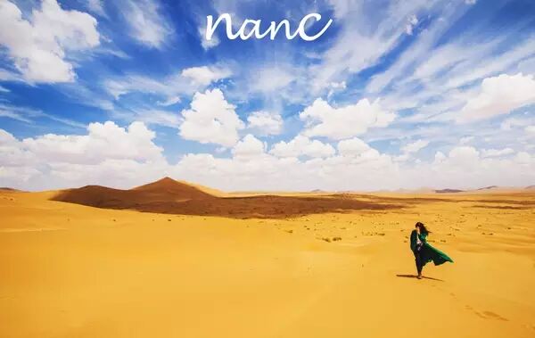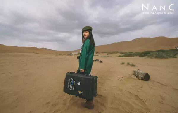 沙漠里有穿着连衣长裙的妹纸,她们拍出的旅行照片是另一种类似时装大片风格。我更喜欢浩瀚的沙漠搭配侠女风的衣服,有一种流浪气息,荒凉孤独。所以选择了长款风衣,中性化的服装。