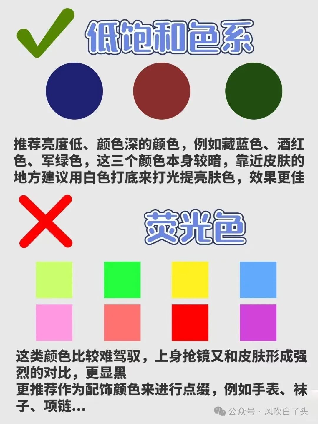 荧光色:荧光色系的衣物通常会显得非常鲜艳,但对于黑皮肤男生来说,这种颜色可能会让肤色显得更加暗沉,因此建议避免选择。