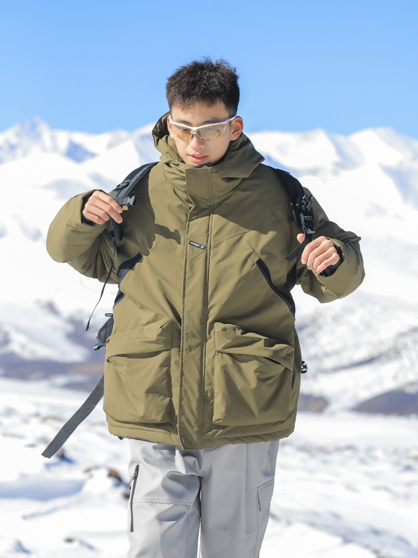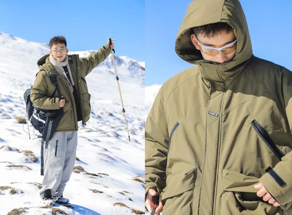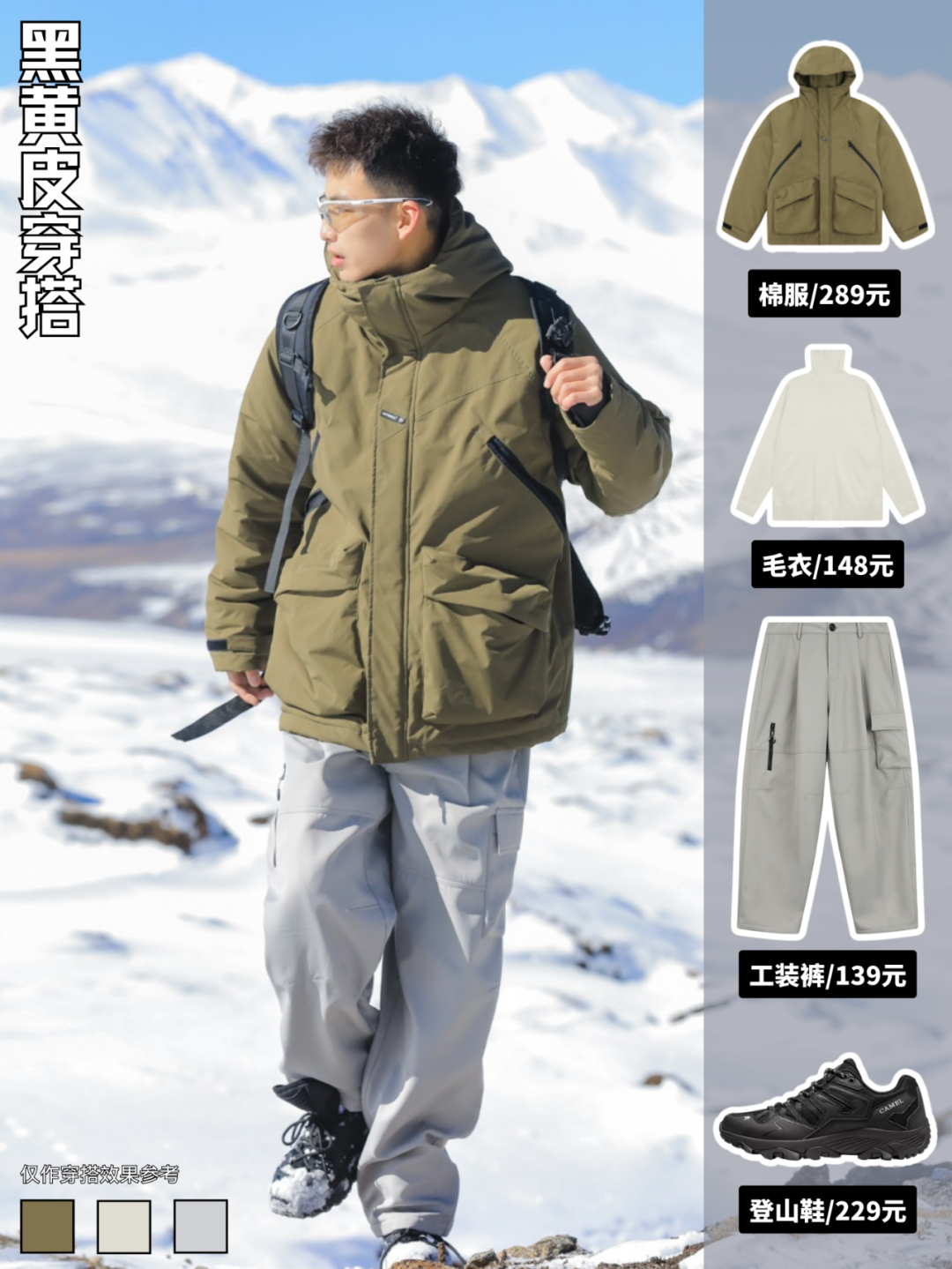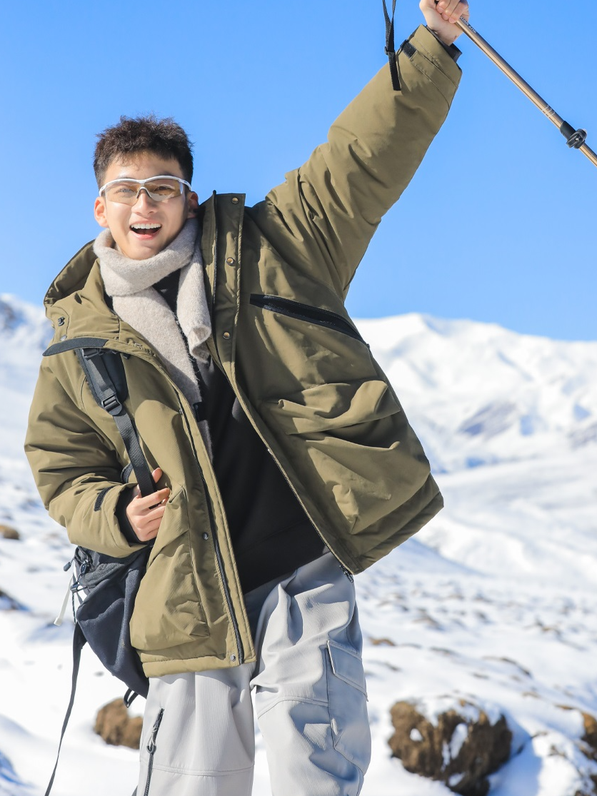 上衣是一件充满工装和户外感的厚实棉衣,双门襟设计,不给冷风留一点机会!立体夹棉的大口袋,搭配口袋绒布,一揣手就暖暖的。