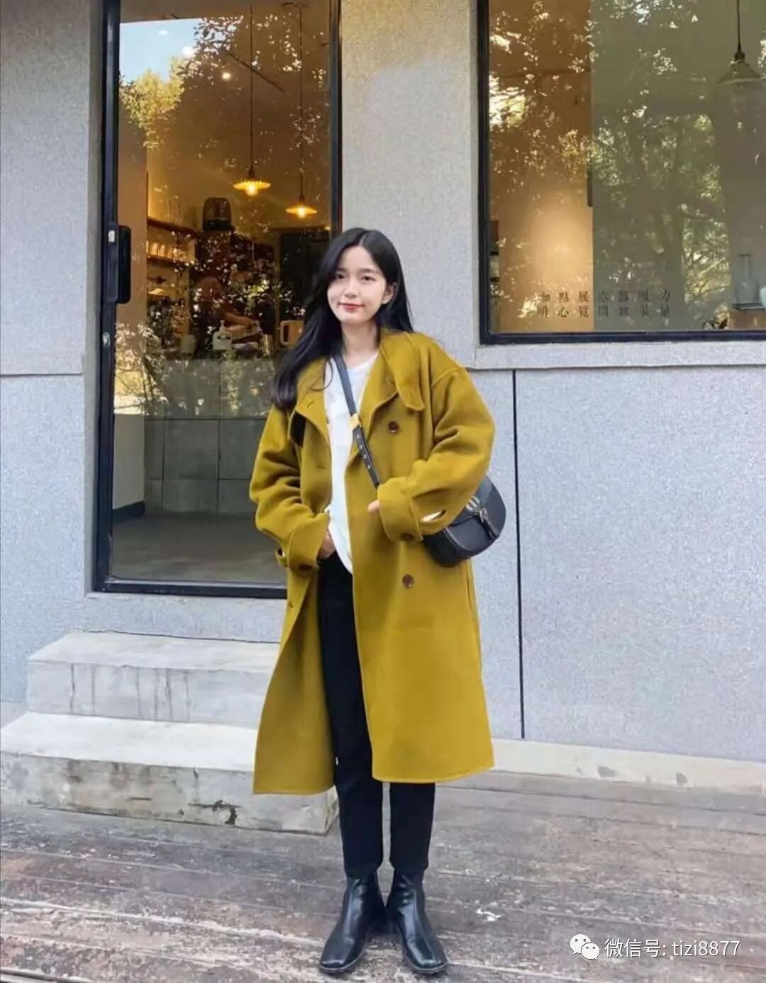 155矮个子女生春季穿衣搭配:这一身穿搭显高显瘦,这件芥末绿大衣的长度155穿刚刚合适,到膝盖下位置能遮肉,扎上腰带还显瘦,日常就配白色的长袖打底,下装选择黑色的牛仔裤和黑色单平头短靴就很韩系。