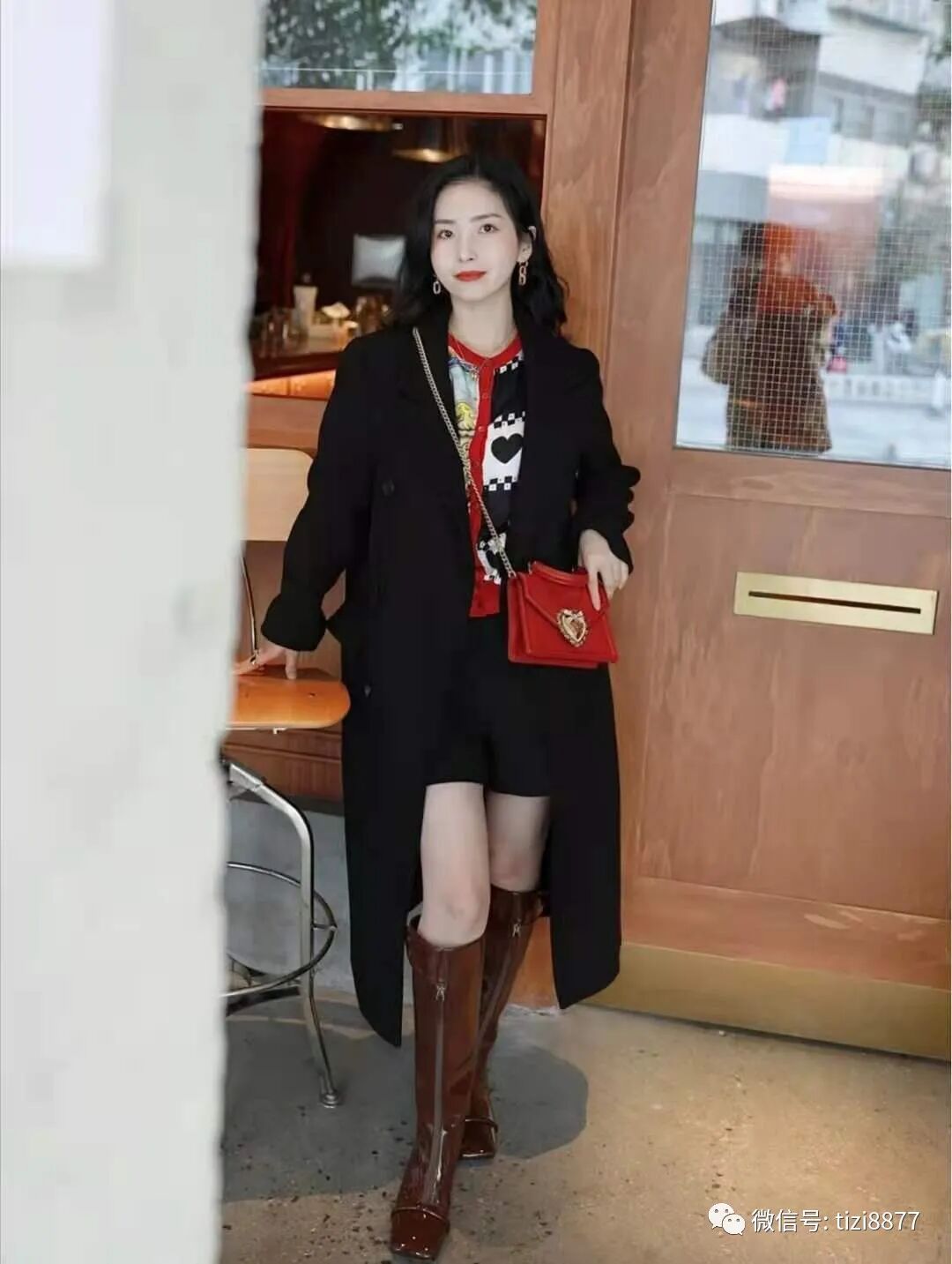 155矮个子女生春季穿衣搭配:穿搭来自Dolce&Gabbana的春节特别系列,府绸拼接针织的印花开衫,骑士和几何设计拼接图案相映成趣,搭配了同系列的度假风胸衣,黑白几何印花时髦好穿。红色Devotion包包是新年也是七夕,爱心金属扣手工打造奢华质感,斜挎手拎都可可爱爱又精致优雅,下身搭配了短裤和长靴,室外搭了一件黑色大衣,显瘦气质的一身完成。