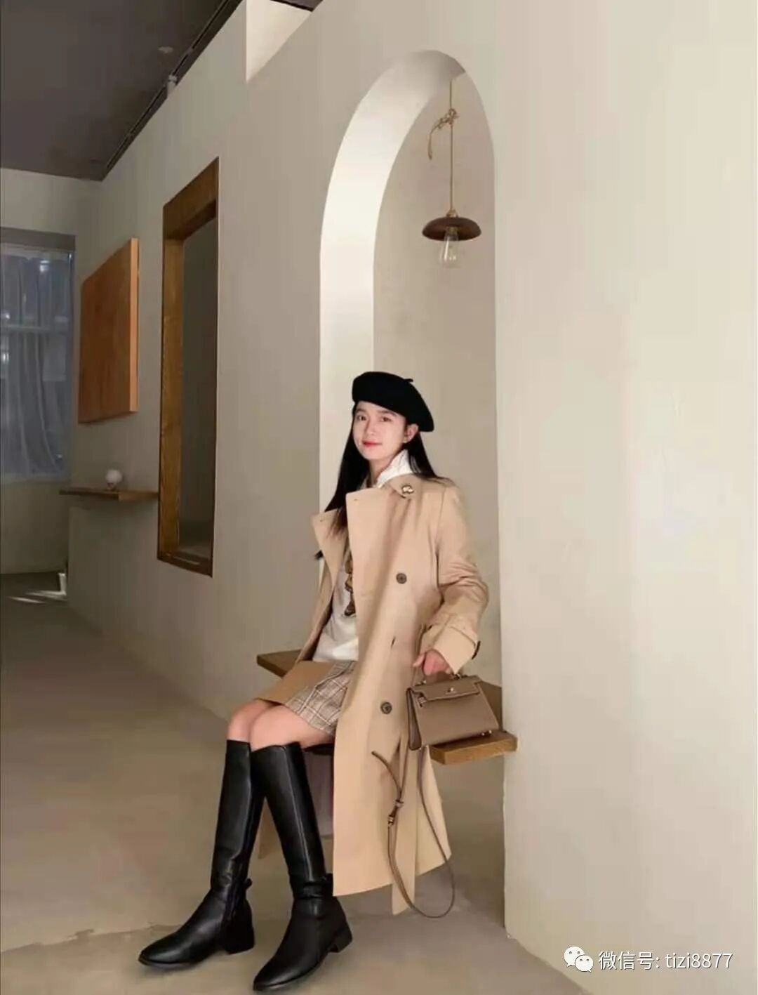 155矮个子女生春季穿衣搭配:这件适合春天的卡其色风衣里面现在搭配了白色的连帽卫衣,即时尚又休闲,下身是双拼色格纹百褶裙加上黑色的长靴,在搭配一个黑色贝雷帽,更有层次感。