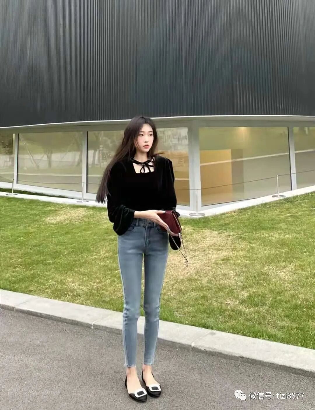155矮个子女生春季穿衣搭配:这件黑丝绒上衣真的是炒鸡斩男,每一个细节都是小心机。黑丝绒上衣是法式甜美风,穿上很美,是完全一见钟情的款式,蝴蝶结可以系前面/后面下装搭配了很显瘦的深牛仔蓝加绒裤子,是高腰的款式,春天怎么穿都好看。鞋子是很淑女的款式,可能不太日常。